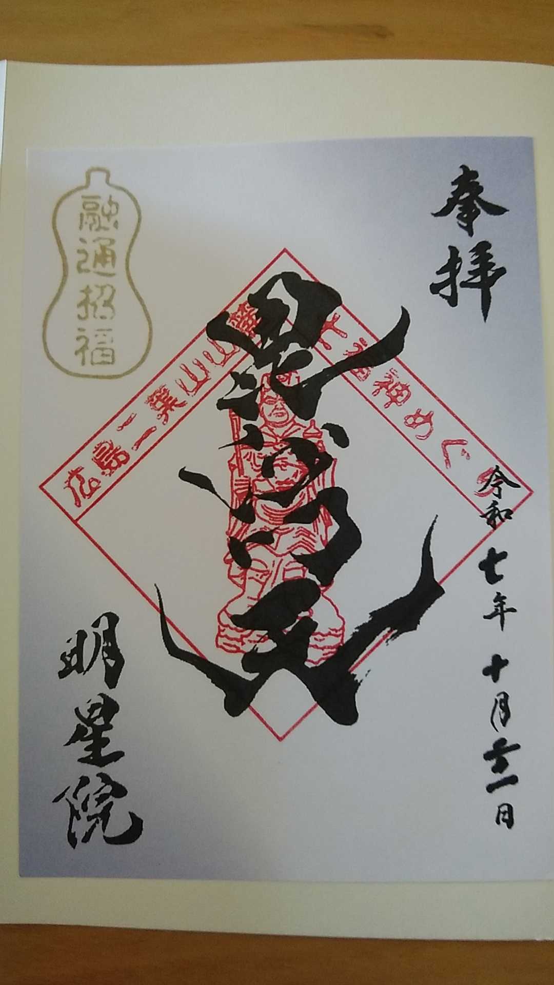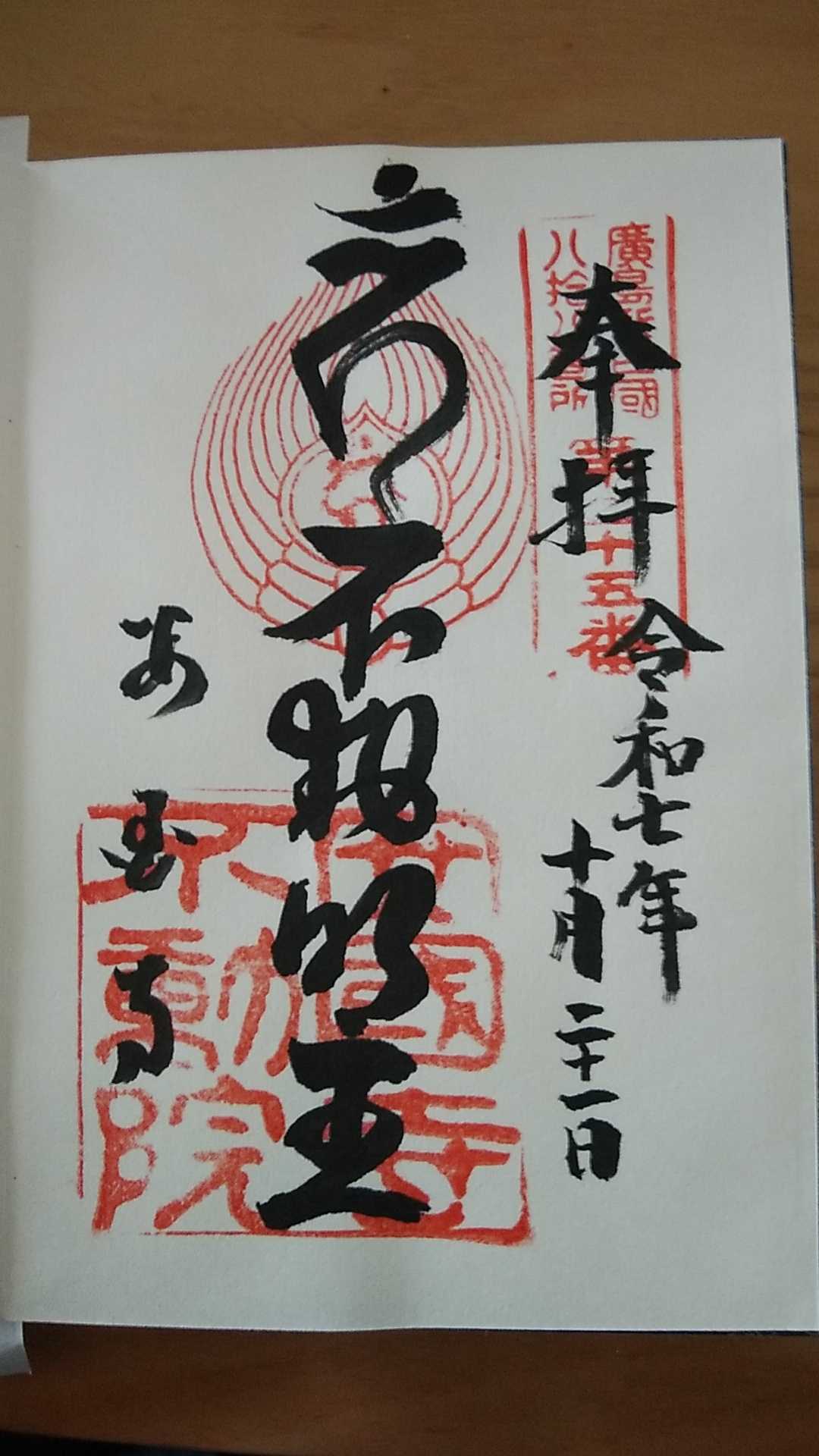 2025年10月21日、広島駅近くの二葉の里歴史的の散歩道を巡ったとき、不動院で頂いた御朱印です。300円のお納めでした。金堂は市内唯一の国宝です。