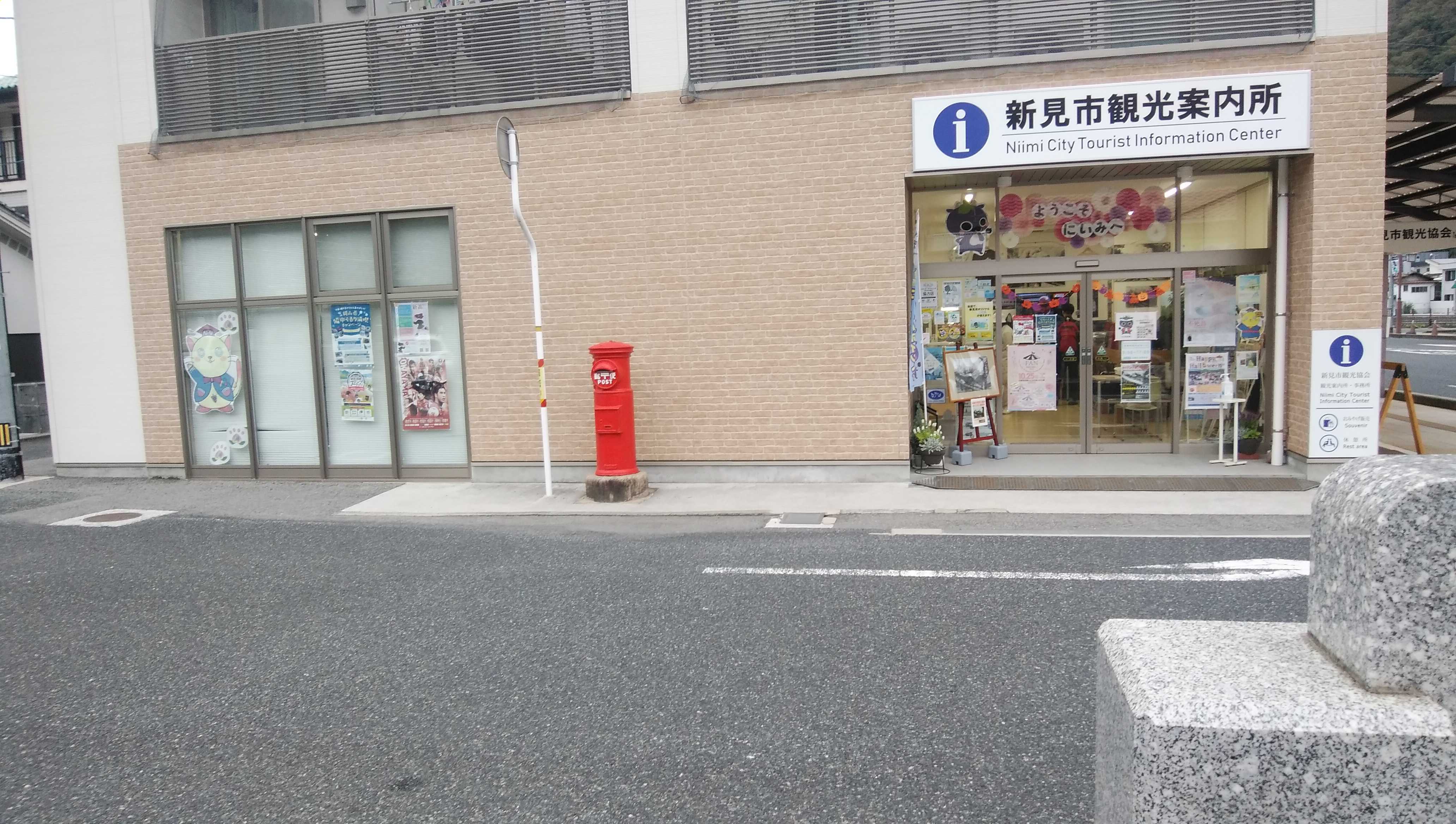 今日、新見駅で列車の乗り継ぎ時間が40分あったので、駅前を散歩しました。駅前の観光案内所前に丸型ポストがありました。