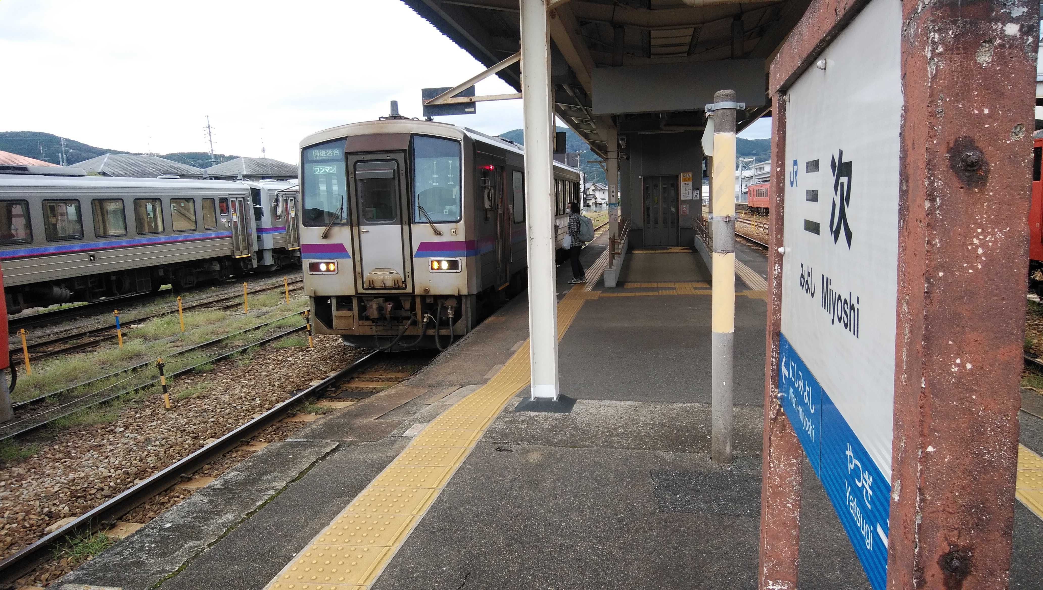 三次駅の3番ホームに入線した備後落合駅行きの列車です。今日は、広島駅から三次駅、三次駅から備後落合駅、備後落合駅から新見駅、新見駅から津山駅と乗り継ぎ乗り継ぎの旅です。