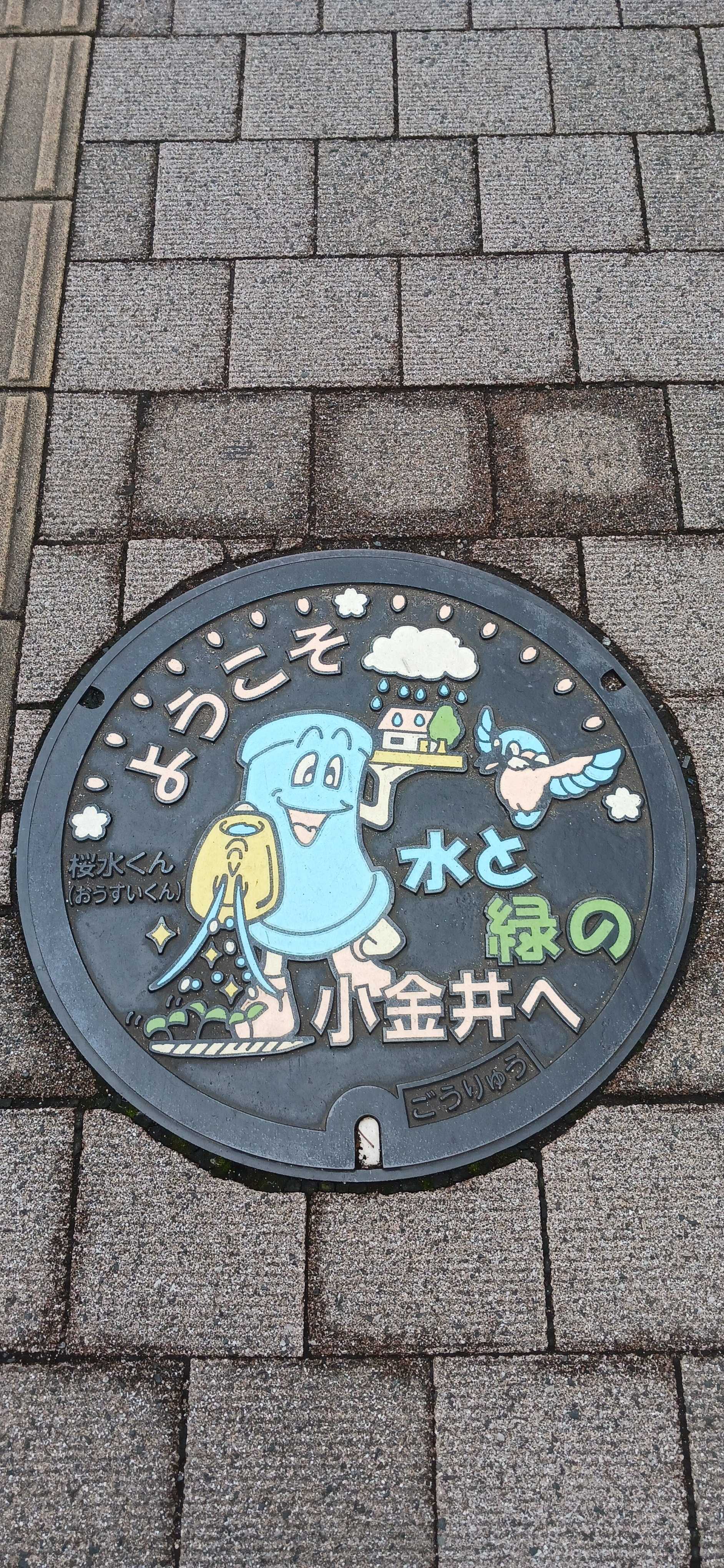 今日、知人に会うため訪れた武蔵小金井駅北口駅前で撮影した小金井市のデザイン下水道マンホールです。マスコットキャラクターは汚水と雨水を合わせて、かつ小金井桜と重ねて桜水(おうすい)くんと名づけられています。