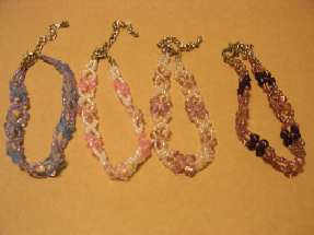 今日は、風があって寒そうな一日。またまた引き篭り・・・。週に一度は、叔母の家に行ったり、従妹ちゃんちに行ったりしながら、少しは気晴らしをしている。でも、おチビちゃんの相手とか、みんなとの何気ない会話は気晴らしになる反面、精神的にストレスもたまるらしく、次の日はいつも完全に引き篭もりになってしまう。。。で、またまた引き篭もりの産物です。同じタイプのブレスレットを、色違いで作ってみましたこんなに作っても、身につけるとアレルギーで肌が痒くなる私使ってくれそうな人がいたら、プレゼントしよう。。。