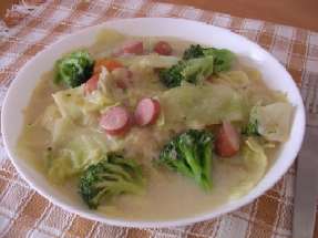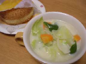 先日、makaronさんが豆乳スープを作っていたのを見て、私も食べてみたくなり、作ってみました。すぐに真似してみたくなる私~家にあった野菜、キャベツ、玉ねぎ、にんじん、ピーマンをたっぷり入れました。豆乳をはじめて使ってみたけど、まろやかで美味しい以前食べた豆乳鍋はまずかったのだけど、あれは、買ってみた「豆乳鍋の素」が悪かったのかしら・・・一緒に写っているのは、くどいものが食べたくなって買ってしまったカレードーナツです。