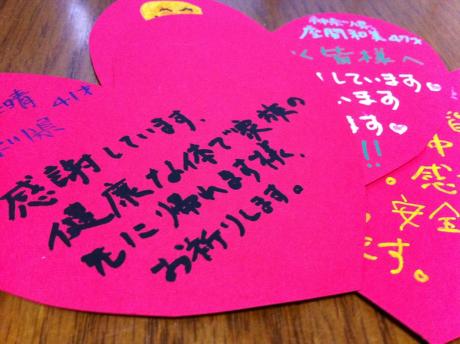 昨日、長女がお仕事休みだったので夕方早々ご飯を食べてリビングで原発作業員の方々へのメッセージを書いていたの。(長女は前回のメッセージはものすごーく大きな字で書いていたんだけど今回は、12cmのハートなので二枚書きたがってました(;^ω^A )それをとなりで晩酌しながら見ていた旦那さん。旦那さんには、私が原発作業員さんたちにメッセージを届ける活動をしていることは知っているし、今回が二回目だってことも知っている。でも、私は「書いて~」とは言ってなかったの。だって強制するみたいで嫌だったから。前回は、「俺の分も気持ちこめておいて~」って言われた(*^-^*)夜、ふとこたつに目をやると一番上に重ねてあったo(´^`)o ウー書いてくれたんだ~~~♪♪♪男の人じゃないとわからない気持ちもあるのかもしれない。。何か大きな想いを感じる旦那さんのメッセージ(・∇・、)きっと作業員さんに伝わるよね・・☆ ありがとう・・・強制するのはよくないけれど直接、遠隔、メッセージ参加の皆さまぜひ、ご家族の方々にもこういう活動をしているんだよと伝えてください。そして、一緒にメッセージを書いて下さったら嬉しいです♪メッセージの書き方講座・・・・・・・・・・・・・・・・・・・・・・・・・・・・・・誰でもどんな人でもご参加いただけます♪スマイルランチ会~ゆったり楽しく思考を実現しよう♪~直接参加 あと3名様遠隔参加 あと1名様メッセージ参加 制限なしです~☆原発作業員さんへのメッセージの書き方講座 こちら☆お申込みフォーム☆返信しながら気付いたこと☆笑顔から☆生み出されたもの☆参加方法は三つです☆11.11スマイルランチ会のご案内♪ゆったり楽しく思考を実現化しよう☆スマイルランチ会の遠隔参加について共同主催 まきちゃんのブログ「スマイルランチ会について」共同主催 みゆきちゃんのブログ「こわい気持ちと 笑顔と 感謝 smileランチ会でお待ちしています」お申込みフォーム福島にお花を植えよう作戦Youtubekazuminのツイッターフォローしてね♪designed BY まよ(^-^*)
