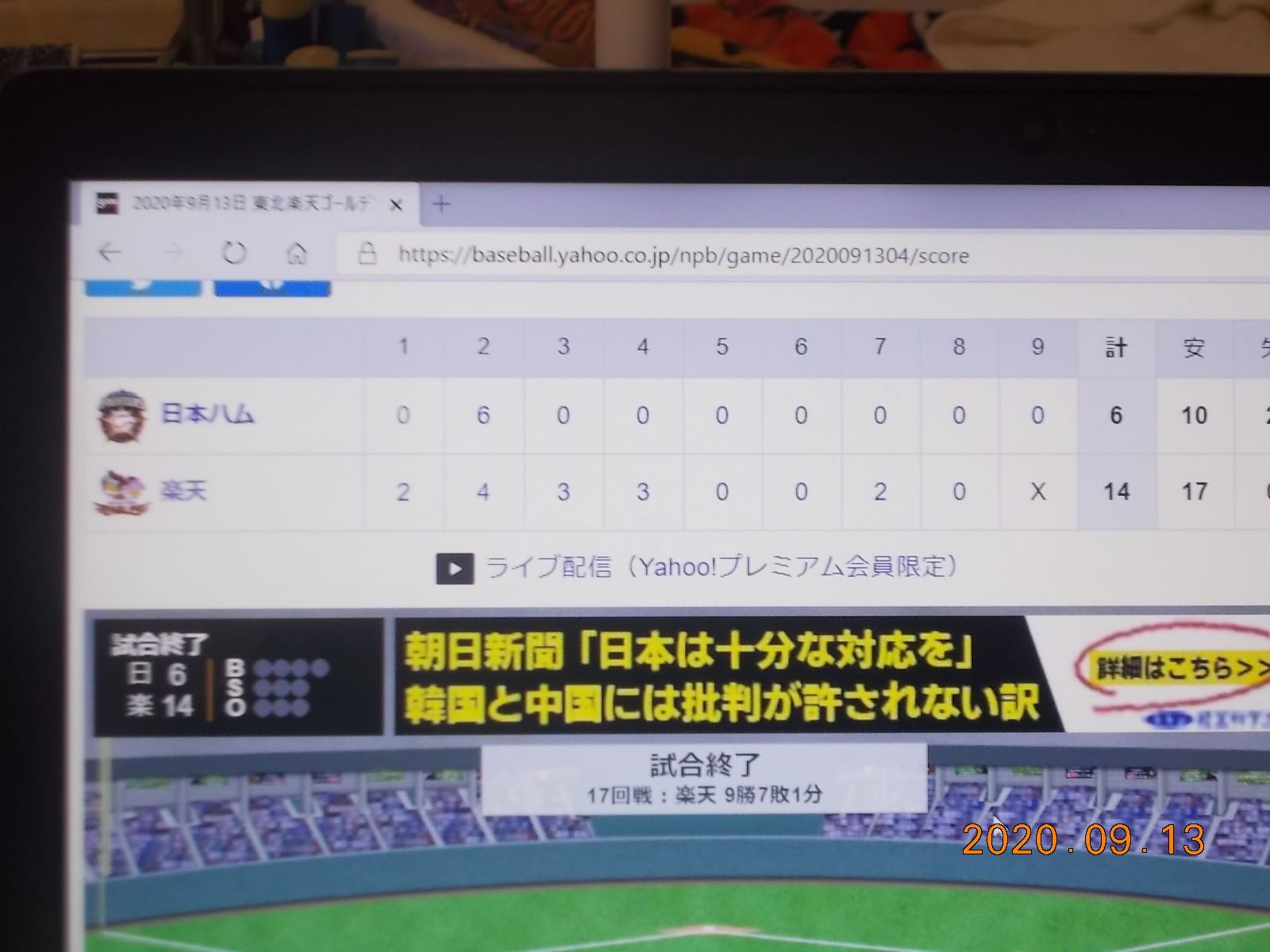 午後からプロ野球テレビで見ていましたプロ野球 昨日は雨で試合有りませんでしたお昼から仙台で樂天対ニホンハム戦です樂天の先発は 岸 です岸 序盤に打たれて6失点です今日はこれで負けとおもいましたところが 直ぐ 樂天 6点入れて同点としました野球って わからないです最終的には 14対6 で 樂天の大勝でした写真撮りました 写真は樂天大勝のテレビ画面です