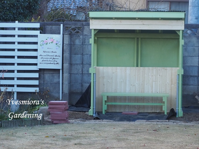 12月14日に続いて、その2週間後の28日に、妹夫婦が、バス停を作りに来てくれました。その2日前に、妹と二人で、出来上がったところに、ペイントしました。白ではなくて、薄いベージュかオリーブ色がいいと思い、悩んだ末、オリーブグリーンに決めました。でも、塗ってみると、思ったよりもグリーンが強いので、少し不安になりました。28日の土曜日は、朝9時から、横板をはめ、後ろと屋根に、トタン板をはりました。仕上げは、年明けに来てくれるそうで、その間、私は、横板のペイントをする予定です。それも来年早々ですね。私自身も、この2週間の間に、つるバラ剪定も3分の2が終わりました。妹とペインとしただけでなく、ブロック塀に、もう1つフェンスを立てたり、トールペイントしたガーデンコンセプトのボードを取り付けたり、サインボード作ったりしていました。新しいフェンスに取り付けた、ガーデンコンセプトのボードサインボードガーデンバス停が出来上がったら、脇にサインボードが立てるつもりです。バラも寒風にさらされてもうこれ以上開かなさそうなので、夕方、残っている花を全部摘みました。玄関周りにしつらえも、クリスマスからお正月に変え新年の準備です。己年の木目込み人形今年も、奴だこも飾りました。玄関先の寄せ植え達も、元気に新年をお迎えします。あちこちの遠くまで出かけたお正月の買い物も、今日で一応終わり、明日は、座敷の掃除と仏壇のお花を買いに行く予定です。そして、31日は、おせちを作り、お重に詰めます。孫たちも、やってくる予定です。来年も、よい年になりますように心を込めて!最後までお読みくださって、ありがとうございます。ブログランキングに参加しています。ポチット押してくださると、ガーデニングの励みになります。にほんブログ村こちらのバラ園芸も、よろしくお願いします。にほんブログ村ありがとうございます。My home page.ホームページです。https://kuboniwagarden.jimdo.comCooking recipe私のオリジナル料理レシピhttps://recipe.rakuten.co.jp/mypage/1280000783/recipe/今日もお元気でお過ごしくださいね。