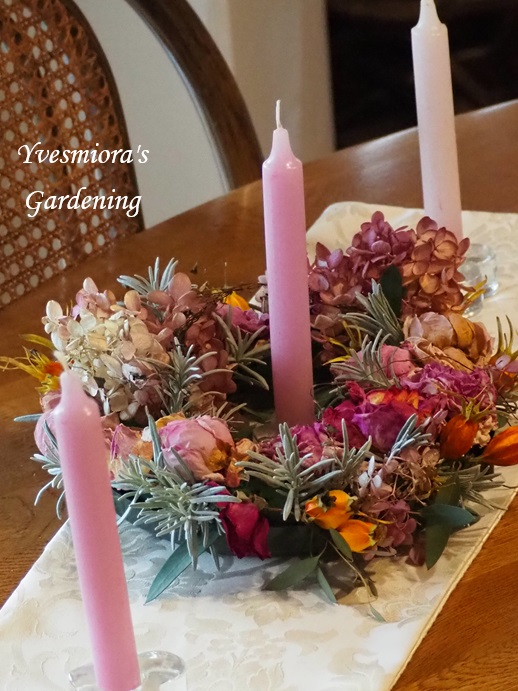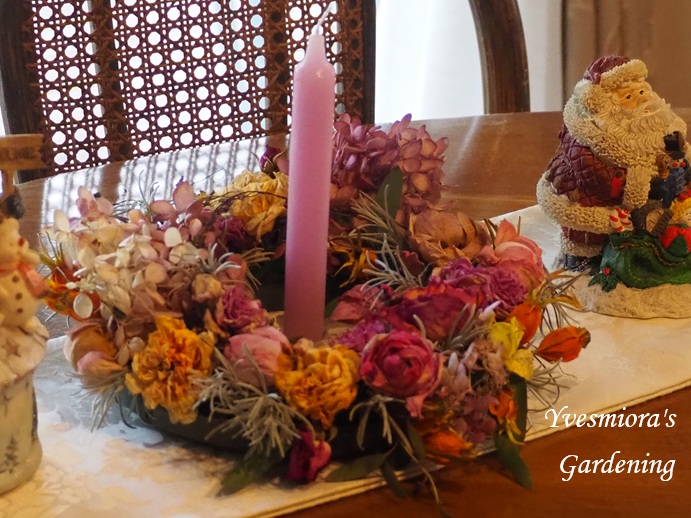 11月の終わりに作ったリースが、乾燥してきれいにドライフラワーになりました。ドライになったリースラベンダーの銀色の葉が効いています。11月28日の生花リースこの後、ラベンダーの葉も挿しましたが、正解でしたね。生花のみずみずしいリースは、本当に素敵ですが、ドライになると、1年位は、このままの状態で楽しめます。差し上げた彼女のリースも、綺麗にドライになったかなクリスマスバージョンで、テーブルに、キャンドルと一緒に飾りました。モミジは、12月に入ってしばらくは、紅葉が綺麗でしたが、ここ2~3日の西風で、だいぶ葉が落ちました。12月初めのモミジノースガーデンの山茶花は、満開になっています。八重のピンク山茶花バラのスワッグは、時間を見ては、せっせと作って、9個まで作り終えました。左は作ったばかりのスワッグ 右は3日経ったスワッグ木立のバラには、花が少なくなりました。まだ差し上げたい人が、たくさんいるので、足りるかなぁ?友人達と、行きつけのレストランと、英会話の先生と、などなど数えていると、足りなそう!差し上げられない人も!今週から暖かい日を選んでつるバラの剪定も始めました。火曜日は、スパニッシュビューテーとブルーマジェンタの一季咲きのつるバラを剪定しました。今年は暖かかったせいか、つるバラも、まだ花や葉がたくさんついていました。1月に入ってからの剪定でもよさそうだと思えるので、ゆっくりやることにします。宿根草の枯れ枝も、目立って汚くなったものは、根元から切り戻すつもりです。やることリストが、まだかなり残っています。昨日は、13年使ったテレビが壊れて、ビデオを通してしか見られなくなてしまったので、ヤマダ電機に買いに行きました。他にオーブントースターと、体重計、ゲスト用の加湿器も買いました。午後からは、収穫しておいたカボスを、マークに手伝ってもらって絞りました。絞ったカボス 約5リットルカボスと柚子の木は、昨年、収穫後に強剪定したので、実付きが悪いと思っていましたが、カボスは例年通り、カート一杯取れました。柚子は、まだ収穫していませんが、まばらの実しか見えないので、かなり少なそうです。その後、余り散らかるので、シランの枯れ葉を屋敷内だけですが、根元から切り戻しました。西風が冷たかったですが、ウインドウブレイカーを着て、切り取ると、90リットル袋いっぱいになりました。やることリスト以外にも、時々、舞い込む仕事もありました。煮たことがないので、遠慮したのですが、我が家で作ったから試しに煮てみてと、頂いてしまった黒豆2日がかりで、コトコト時間をかけて初めて煮た黒豆でしたが、薄味でふっくら煮えたので、時間と手間はかかりましたが、満足しました。最後までお読みくださって、ありがとうございます。ブログランキングに参加しています。ポチット押してくださると、ガーデニングの励みになります。にほんブログ村こちらのバラ園芸も、よろしくお願いします。にほんブログ村ありがとうございます。My home page.ホームページです。https://kuboniwagarden.jimdo.comCooking recipe私のオリジナル料理レシピhttps://recipe.rakuten.co.jp/mypage/1280000783/recipe/今日もお元気でお過ごしくださいね。