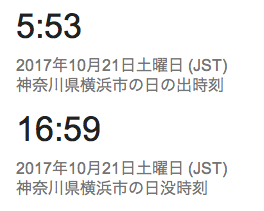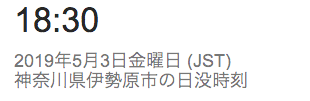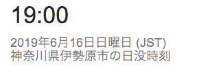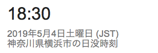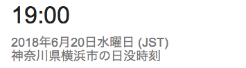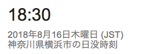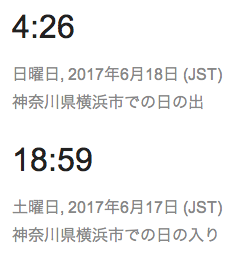 今日の日の入りは、18:59。あと2〜3日で19時台に突入しますね。(画像はGoogle検索で、”横浜 日の出 日の入り”で検索したもの。)一番遅いのが19:01でして、その後7月には早まりはじめますが、夏休みのころも18:50〜18:10ぐらいをキープするんですね。って、まだ梅雨の最中ですが。詳しくは、下のリンクを参照下さい。参考リンク;国立天文台>暦計算室>各地のこよみ>横浜のこよみ
