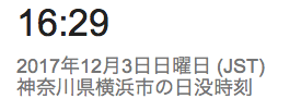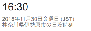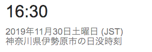 11/30 日の入りが16時半台に突入しました。 これから12/10日ぐらいが最速の16:30付近です。その後、年末には16:40ぐらいに伸びます。11/30 日の出は6時半より遅くなってきました。 これから年明けの6:50付近まで遅くなります。日の入りは、夏至の頃に比べ、2時間半早くなりました。日の出は、夏至の頃に比べ、2時間以上遅くなりました。合わせて昼間の時間が4時間半以上短くなりました。冬本番です。