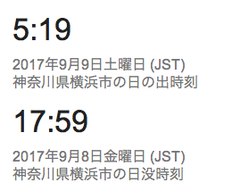 9/30 日の入りが17:30を割り込んできました。 9/30 日の出が5:40ぐらいになっていました。 日の入りが夏至の頃に比べ、1時間半早くなりました。日の出が夏至の頃に比べ約1時間15分ほど遅くなりました。合わせて昼間の時間が、2時間45分ほど短くなりました。参考リンク国立天文台>暦計算室>各地のこよみ>横浜のこよみ