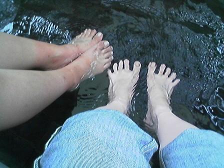 伊豆の下田駅の足湯の二人の脚の写真です☆