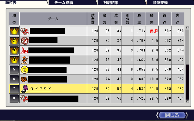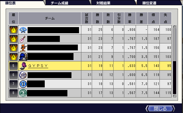 今日はSteady & Co. feat.Azumi - Only Holy Storyです♪旅行後は研究の中間発表に追われてましてなかなかブログまで更新する時間がありませんでした。先日ようやく発表も終わりまぁ問題点とか出てきたわけですが、とりあえず大丈夫そうです。また年明けたら論文書かないといけないので忙しくなりますが。。。それじゃやきゅつくの話。まずはプレミアの結果から~。まぁこんなもんでしょう。次のプレミアではCT進出を目標に!次は留学出してた選手。大道先生は留学出しとけば間違いないみたいな位置づけぽいので留学に送り出したわけですが。。。見事に失敗wまぁ一応能力値は上がるですがこれじゃねぇ。。。とりあえず使わないのはもったいないので特打ちつけて無理やり能力あげてます(´ω`)岡田と会田は普通成功ですが頑張ってもらいたい。そして現在の1ペナのほうはというと。なかなか良い順位にいます。ただ現在2位のチームが前回プレミア2位の強豪さんでオーダー見る限りでは結構私のチームとは力の差があります。終盤でもこの展開ならやはり試合カード使うことになりそうです。前回のサイクルでブーマーがいなくなりレジェンドどうしようかなと思っていましたが平松が出たので今回は平松使ってます。なんとなく変化99にしてみました。成績のほうはまぁ可もなく不可もなくといった感じ。最後に今日研究室で暇つぶしにやきゅつく起動していたらトーナメントの受付が。だいたいは時間が合わず参加できないんですが今回はかなり久しぶりに参加。すると・・・よくブログ拝見してる方と激突してました。今回これを機にちゃっかりお気に入り登録。RSのほうも自分がシーフやってたのもあって装備すごいな~といつも思っていましたが、やきゅつくのほうも強いです。なんか1点差で負けたので余計に力の差を感じてしまった。同じ鯖ですが極力同じリーグは避けて欲しいところですw最後にRSのほうで大型UPがあったみたいでもう少ししたらINしてみようかなと思います。まぁ年末ぐらいですかね。その時はたぶんシーフ転生させます。それじゃ今日はこのへんでーノシ