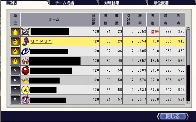 今日はABBA - Thank You For The Musicです♪それでは早速やきゅつく。まずは現在の順位から~。今日はまだINしてないので昨日の順位ですがまぁそんなに変わってないでしょう。ここまでくると欲が出るもんで、2位で景品が欲しいなとか思ってます。1位はもう無理wそれでちょっと今日は同じリーグのチームがすごいんで勝手に紹介。ほぼ巨人染め!しかもこのチーム最初のほう首位を走ってました。現在も上位にいます。プレミアでこれはすごいな~。自分はソフトバンク染めをしたいのだけど・・・考えたら絶対きつい。まずプレミア行くのも無理なんじゃないだろうかwまぁ杉内でも当たった日にはソフトバンク染めやりますよ!次回は2ペナで留学出してた選手の紹介でも。それじゃ今日はこのへんで~ノシ