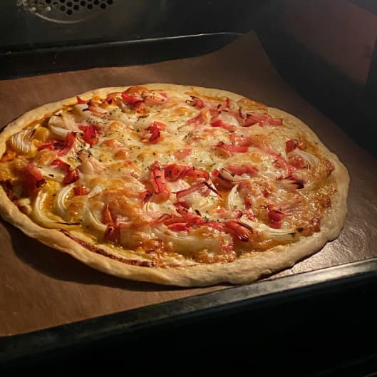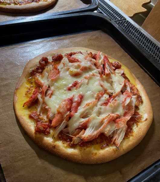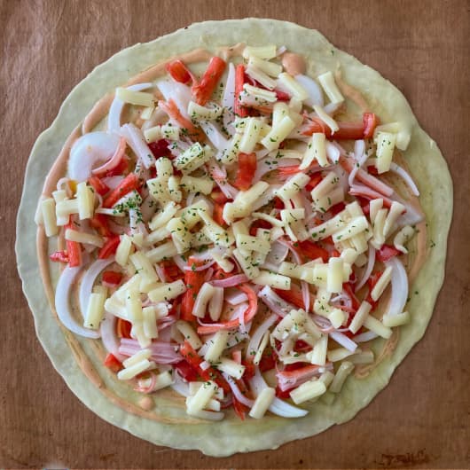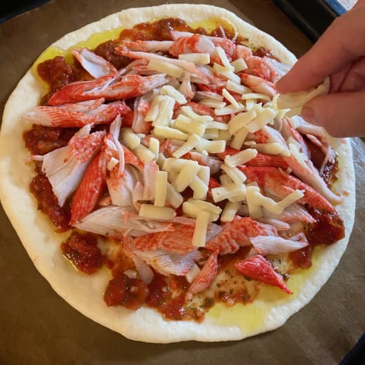 こちらは時間がない時の発酵なしパリパリ生地のカニカマで作るカニマヨピザ
