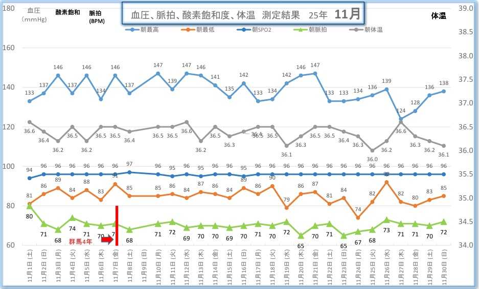 血圧 酸素飽和度 体温記録2025年11月11月上旬、中旬は血圧は高い日が多い。やはり…