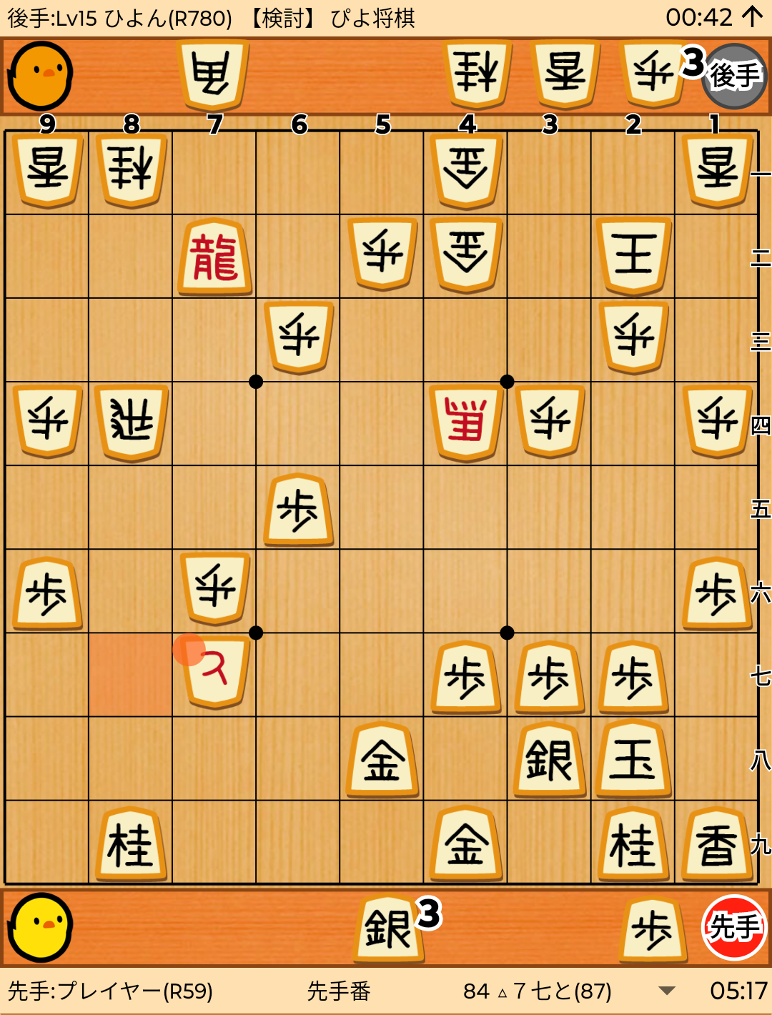 拙いブログにお立ち寄りくださりありがとうございます😊今回、初めての投稿でどんなことになるか、心配しながら綴っています。アプリ・ぴよ将棋の対局になります。▲△次の一手先手:私後手:ひよん3級(R780)さん手合い:平手持ち時間:10分。切れたら30秒。戦型:中飛車▶84手目△7七とまで。先手番。あなたが浮かぶ一手は?>>>>>>>棋譜を振り返ります。▶70手目△8四飛駒損して形勢は先手不利な局面でしょう。更に、後手から金取りの△5七桂打ちが見えています🥹🟧次の一手〜好手ではないかな・・・▶85手目▲8五歩打ち。飛車取りの《値千金》の歩打ち。△同飛なら、▲7四竜で飛車、馬の両取りが待っている。形勢は持ち直したように映る。5手詰ハンドブック新版 [ 浦野真彦 ]将棋世界 2025年 12月号 [雑誌]▶99手目▲3四桂打ちこの桂を打てたことで、《詰み筋》が見えてきた。▶101手目▲2二角打ちこの手が打てて、先の希望が見えてきたかな。▶109手目▲4五銀打ち後手は角を打って必死の守りに、後手玉に迫る銀打ち。▶121手目▲4四同馬まで先手勝利。最後までお目を通してくださりありがとうございます😊ご感想などお気づきの点がありましたらお気軽にコメントしていただければ嬉しく思います😘ではまた、ご機嫌よう(*^^*)