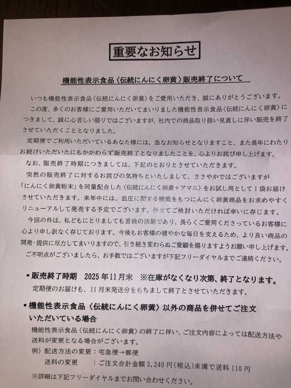 先日、定期購入の商品が送られてきましたが、その中に「伝統にんにく卵黄は11月末で販売終了」という案内がありました。