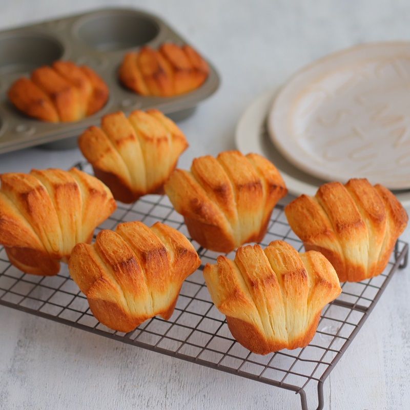 やっとレシピブログさんの連載を更新してきました~!やっぱり折り込み生地のレシピ作りは写真が多くて時間がかかってしまいました^^;でもクロワッサンよりは成形は簡単なのでお試しを♪でも生地作りまでの手間はクロワッサンと同じなのでクロワッサン同様のバターでもいいような(笑)粉に対してバターの量がクロワッサンよりは控えめで若干ヘルシーで成形は超簡単なのでご安心をレシピはこちら↓サクサクが美味しいバターフレーキー焼ける時のバターの香りがたまらないパンです。そして1枚1枚めくって食べるのが楽しみでもあるパンです。3つ折り×3した生地をカットしたものを重ねてマフィン型に入れて焼いただけ~。作り方はぜひチェックしてみてくださいね。こんなのが8個できちゃうので4人家族なら1人2個食べられます♪クロワッサン系の生地のパンなら我が家でも瞬殺でなくなる嬉しいパンです。Happy Delicious Bakery にご訪問ありがとうございます。ブログランキングに参加しています。よかったらポチっと応援してくださ~い♪↓ cottaオフィシャルパートナーとして活動中です。↓レシピブログさんのパンの連載更新しています。↓私の姉妹お菓子ブログ♪↓インスタグラムはこちら↓