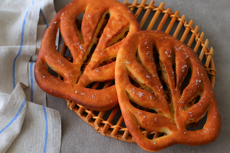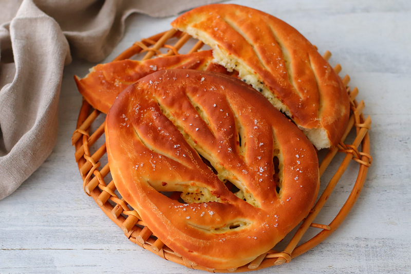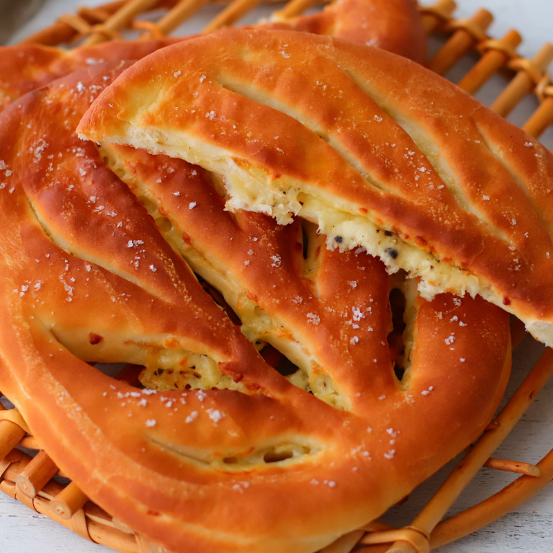 中はチーズとブラックペッパー、仕上げにオリーブオイルと岩塩のアクセントが美味しいパンです。