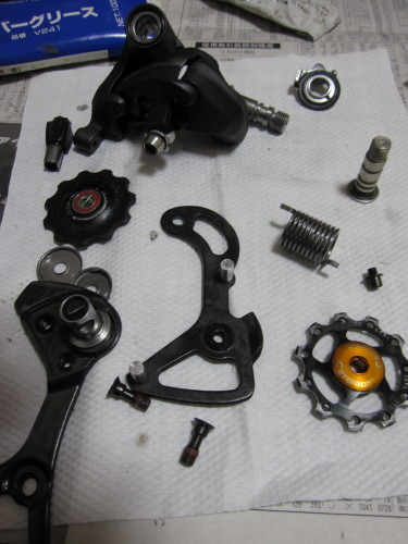 7900から9000に変更したので、7900をオーバーホール中。7900は、コルナゴに今年中に搭載予定。中まで分解して、パーツクリーナで清掃したら汚れが出る出る。5年使いましたが、途中で何度か整備はしていますが・・・。ここまで分解するのは久しぶりです。STIレバーは不用意に分解すると元に戻らなくなり、ヘタすると壊れるのでこの辺でやめておきました。コルナゴに載せるのが楽しみです。