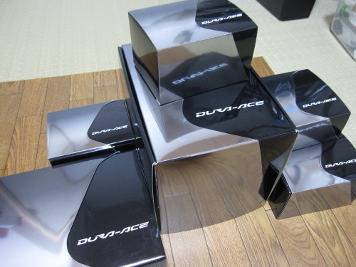 シマノ製品が値上げと言うのは先日お知らせしましたが、消費税もまもなく8%に・・・。なんか気が焦ってしまい・・・10速でしばらくがんばるといっていたのにもかかわらず、自分の弱さに反省しなくてはいけないと思いつつ↓9000DURA-ACEです。箱が立派すぎ・・・。ちなみにデュラエースは値上げ対象外らしいですが、「為替相場が思わしくなく、原材料費もあがっているので、やっぱり値上げする!」とシマノが言い出しそうで、思い切って買っちゃいました。なお、うちの財務大臣様にご許可済みです。気が引けたので、財務大臣様にも、お財布(同等品)を小生の特別会計から購入させていただきました。今回は、底値だったら買ってよいという条件でしたので、こちらのお店を利用しました。 激安でちょっと不安だったんですが、ちゃんとした対応で全然問題なく、在庫があったので、発注から3日で届きました。支払が振り込みか代引きで、カードが使えませんが、そのぶん安いと理解しています。送料はかかりますが、値引きを考えると仕方ないかなと思います。思えば、デュラエースは7400からなんだかんだ買っているわけです。一番最初がいけなかった。当時、STIレバーがデュラエースしかなかったので、デュラを買うしかなかったのです。それが良くなかった。モデルチェンジがあると、ギア段数が変わったりするので、消耗品(スプロケット・チェーンなど)のことを考えると、買い替えしたくなります。ただ、デュラエースから下のグレードに買い換えるのも、性能ダウンするようで気が進まず・・・。105もあれば、十分だって良くわかっているのですが・・・。毎回フルセット買っていたわけではないのですが、RDとSTIは、ほとんど買っていました。今回は、シマノさまの陰謀でほとんど互換性がないという恐ろしい策略にまんまとはまりフルセットに・・・。節約生活をますます強化しないと・・・。<歴代デュラーエース記念撮影>RDだけは、売らずに全部とってあったので撮ってみました。全部実装したRDです。すべてOH済みですので、いつでも再起動できますが、STIがないので、使わないのかな?(今回は、7900は、コルナゴに移し変える予定です。)今日は、ブレーキだけつけてみましたよ。BR-6800よりやっぱり強力です。レバーの引きの強さはかわらないけど・・・。BR-7900より、コントロール性が上ですね。BR-7900のときは、シューの取り付けボルトがスチールでしたが、今回(BR-9000)は磁石に反応しないうえ、持った感じ軽かったのでだぶんチタンに変更されています。それから、初期ロットで指摘されていたBR-9000のクイックレリーズレバーの不良問題。(クイックレバーを、閉と開の中間位置くらいにする。その状態でブレーキレバーを握りこむと、クイックリリースレバーが"開"の方にずるずると動いてしまう)ためしにギューギューにぎってみましたが、開かなかったので、現在のロットでは改善されているようです。他のパーツは、これから組みますが、いっぺんに組まないで徐々にくみ上げていこうかと思っています。 【ポイント3倍】■送料無料■BR-9000 シマノ デュラエース 【後のみ】 ブレーキキャリパー (IBR9000AR82A) DURA-ACE 9000シリーズBR-9000 【後のみ】シマノ デュラエース ブレーキキャリパー (IBR9000AR82A) DURA-ACE 9000シリーズ SHIMANO【ロードバイク】【自転車】(bebike)【ポイント3倍】■送料無料■BR-9000 シマノ デュラエース 【前のみ】 ブレーキキャリパー (IBR9000AF82X) DURA-ACE 9000シリーズBR-9000 【前のみ】シマノ デュラエース ブレーキキャリパー (IBR9000AF82X) DURA-ACE 9000シリーズ SHIMANO【ロードバイク】【自転車】(bebike)