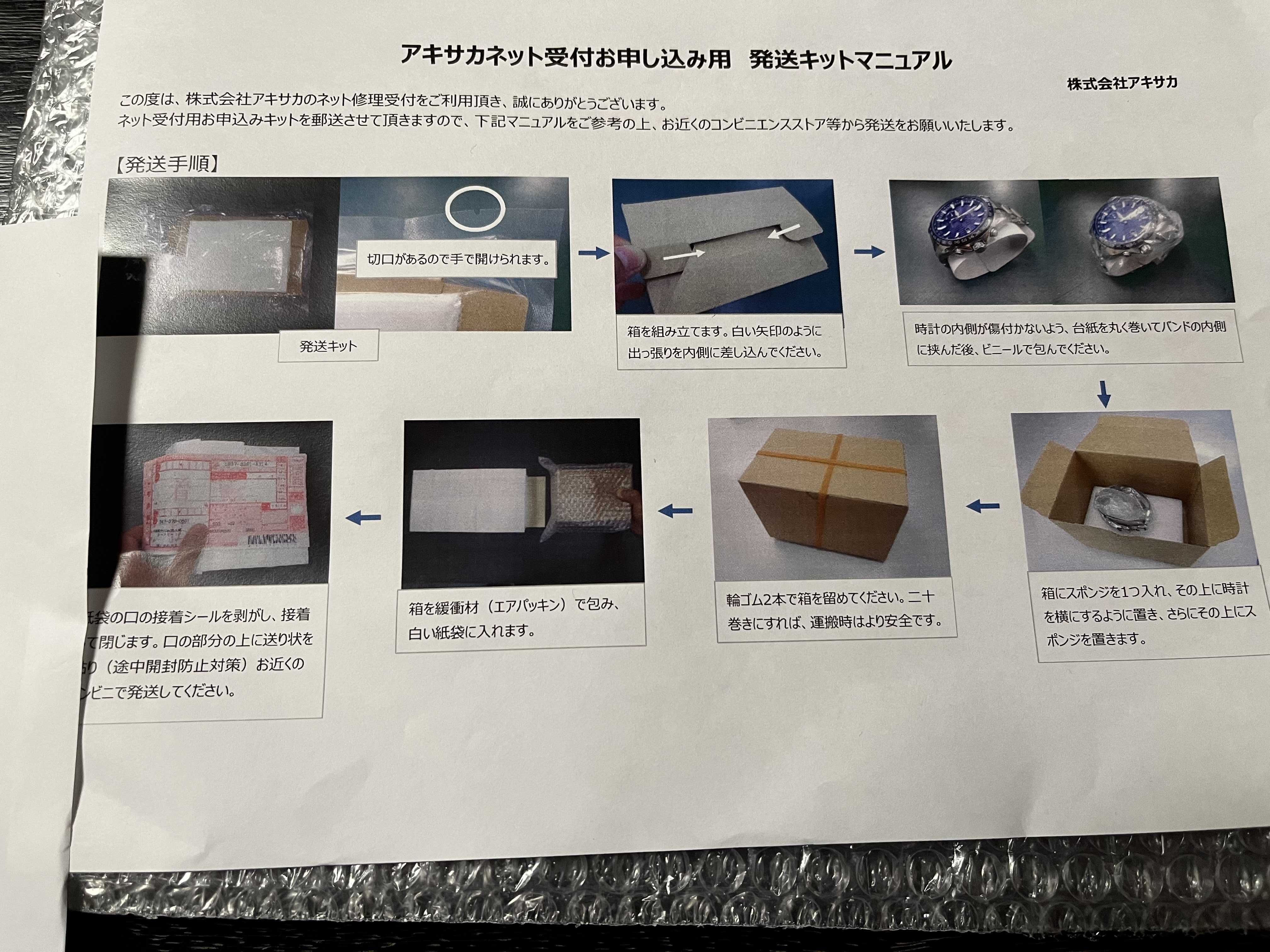 箱を組み立てて、ビニールにくるんだ時計を箱に入れます。緩衝材として、上下にスポンジが入っています。それを箱を袋に入れて、コンビニからクロネコヤマトの宅急便着払いで発送しました。