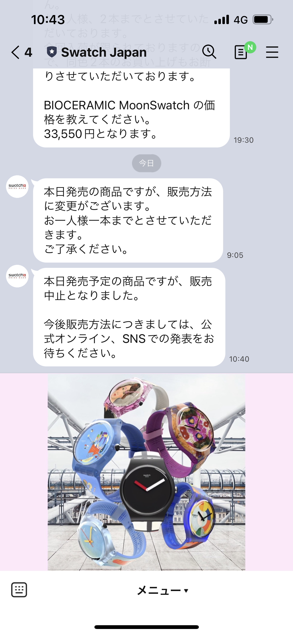 9時の時点で、スウオッチ公式LINEで通知があり、一人一本まで。(嫁の分は確保しよう!)