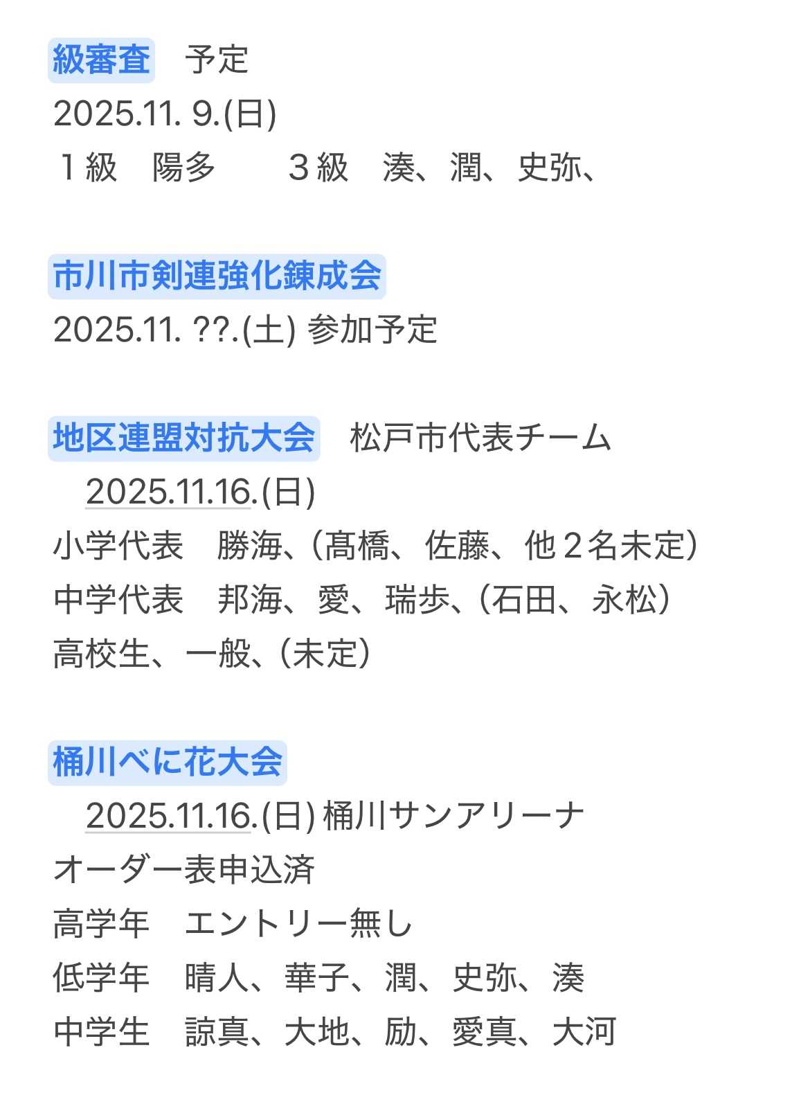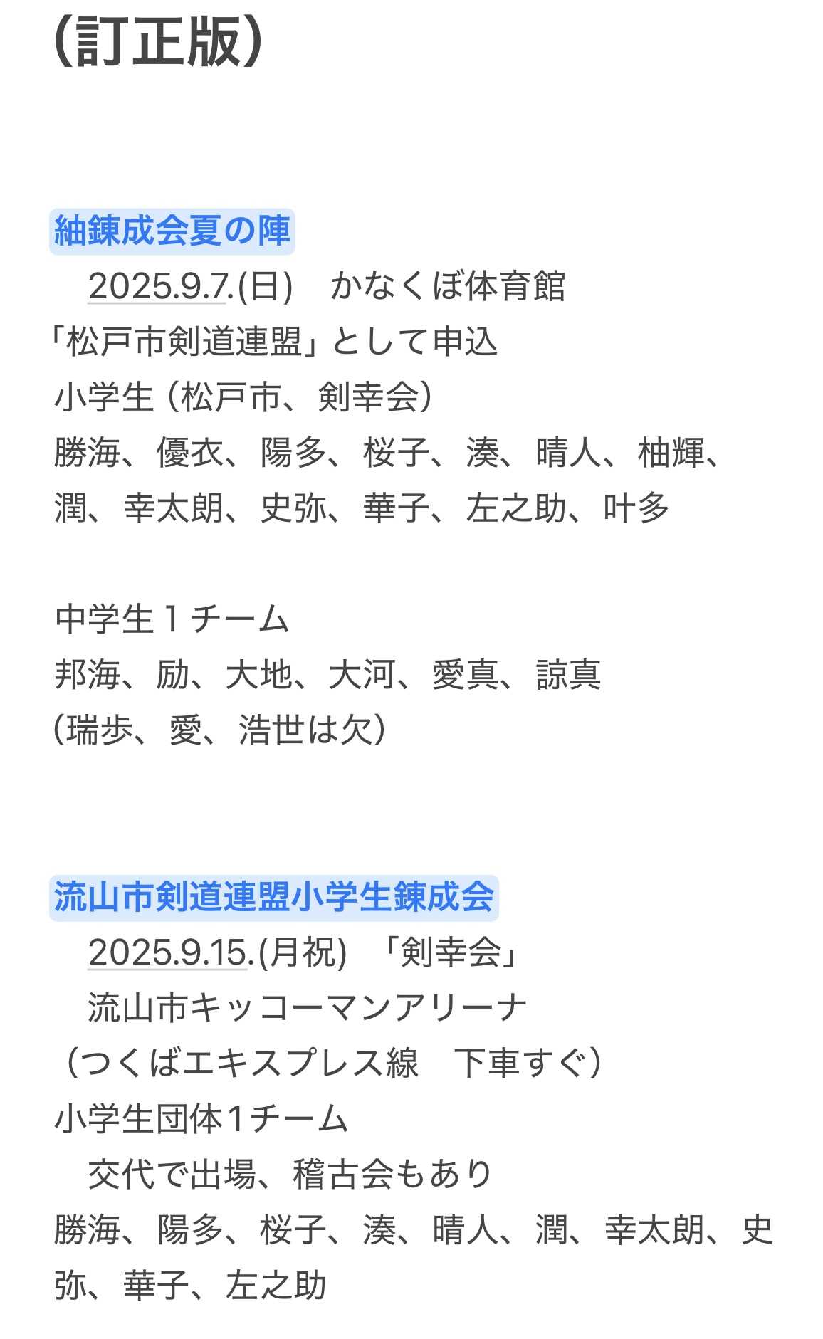 結城尚武館の紬錬成会 夏の陣お疲れ様でした松戸市剣道連盟の皆さんのご協力に感謝しますありがとうございました秋冬の陣もご協力よろしくお願いします🙇次の大きな行事は松戸市民大会ですね。普段一緒にお稽古している仲間もこの日は敵味方になりますが、強豪チームのレギュラー争いも一緒かな。さて、剣幸会の市民大会団体戦メンバーですが、まず、中学生男子の部 中学1〜2年生が学校からのエントリーになるので、いつもは残りのメンバーで5人いないと個人戦になるのですが、今年から大会ルールが少し変わりまして、その場合は連合チーム可能となってます。そこで、愛ちゃんが小さい頃から育った剣誠会と剣幸会が組むと5人になるので、初の連合チームが誕生しました。剣幸会中学3年生チーム対新松戸南中学校は、市民大会2連敗中で、先輩達は敗北してます。(北島兄大将、平川優太大将で連敗)😭阿部鼓太郎大将の時以来、現役を倒す優勝を目指します🫡さて、小学生の市内大会メンバーは、いつものように ☘️春は学年優先と経験値優先のメンバー 🍂秋は、夏休み稽古回数の多い子優先のメンバー秋の市民大会は6連覇中(1回中止なので7年間死守)してますが、今年はねー(笑)^_^ 4年生史弥が経験値5ヶ月でメンバー入りしてます 湊が4年生で大将に昇格してます あと、一カ月あるので、どこまで行けるか楽しみにしてますよ😊11月〜12月の対外活動の予定 現時点では下記のようになっています