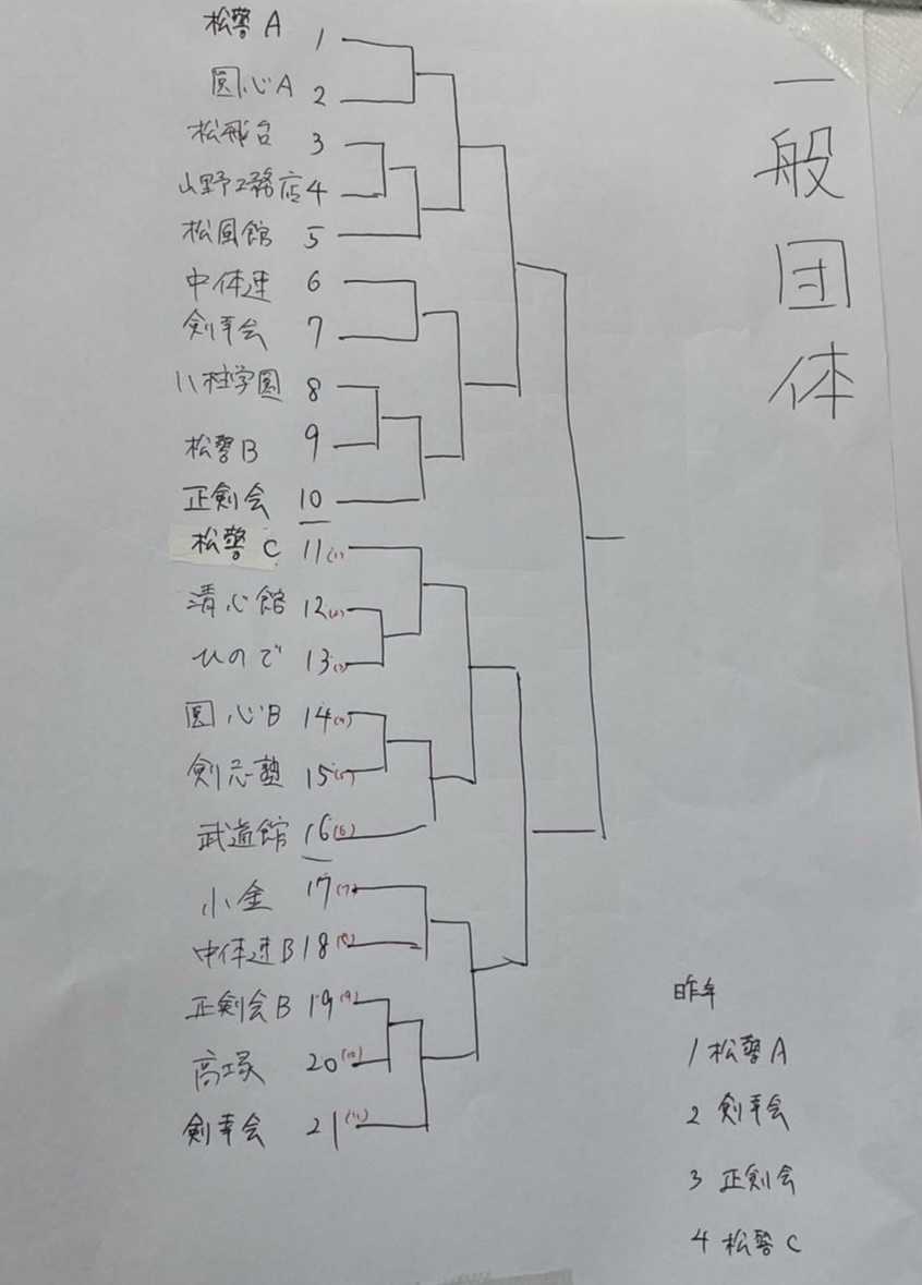 一般の部団体戦は抽選の結果下記のとおり21チームだから、105名これに、個人戦女子16名、男子52名。計173名のエントリー小学生が17チーム、中学生と高校生もやるから、大会、例年より、かなり長引くよね