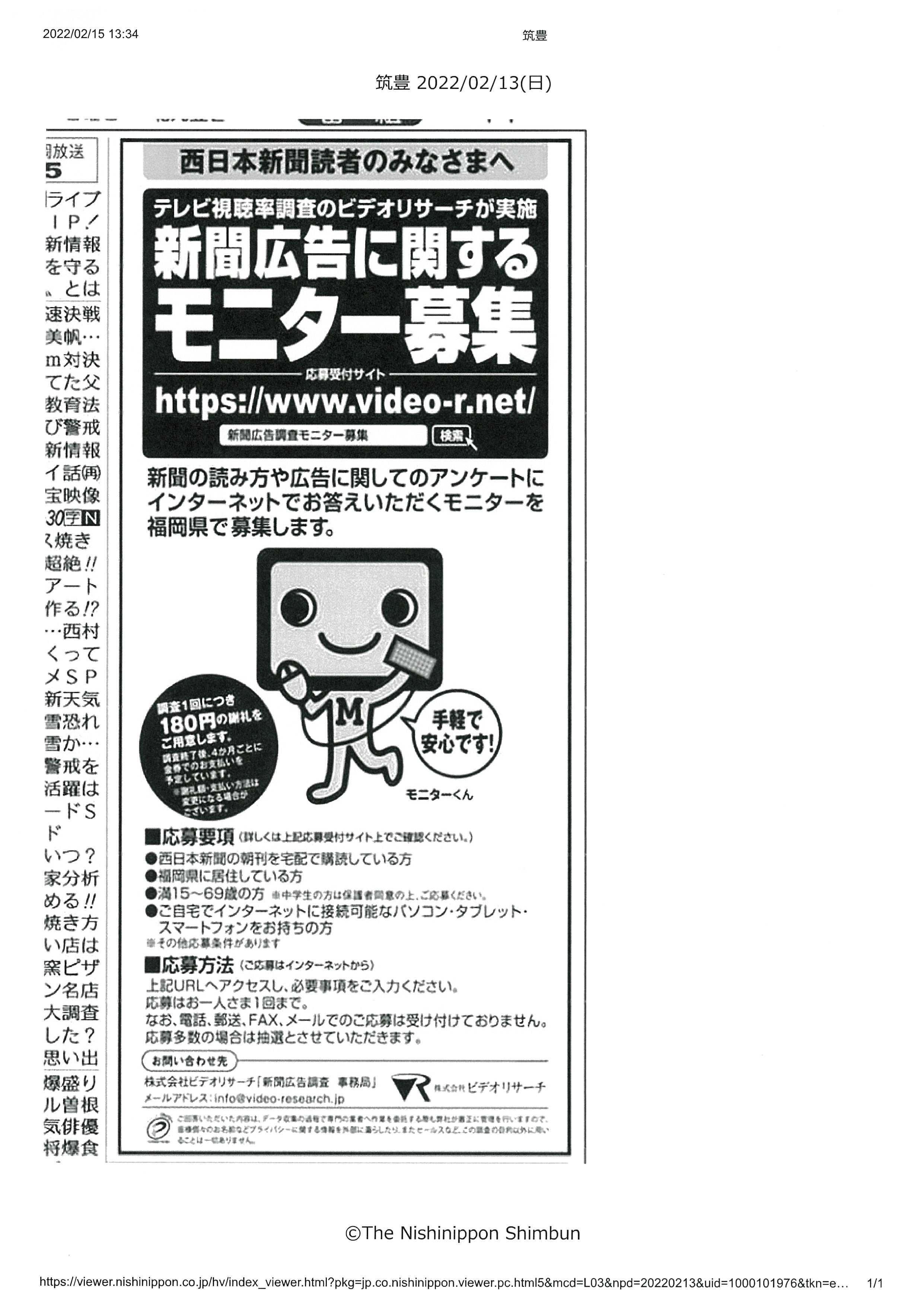 わたくし=末次賢治は、新聞広告モニターを長年しております。この紙面での募集の通りですこれは、購読している新聞紙に掲載されている広告(たいてい6広告ほど/1回)についてアンケート質問形式にて、私見を回答し、そして、1回ごとに報酬 180円を頂くものです。たいていは、毎月4-5回は、アンケート依頼があります~~~~~~~~~~~~~~~~~~~~~~~~~~~~~~~~~~~~~~~~皆さまも、応募なさったら如何でしょうか??たいていは、毎年2月~3月と、8月ごろと、年に2回は、募集があります。私の場合は、このモニターで、年間にして2万円近くの報酬を得ております。とくに「ひとり親世帯」のお母さん方や、お子さんたちも応募したら良いでしょう。特にお子さんたちには、良い社会勉強となりますでしょう。末次通訳事務所・慈善活動部Mar.04 2022