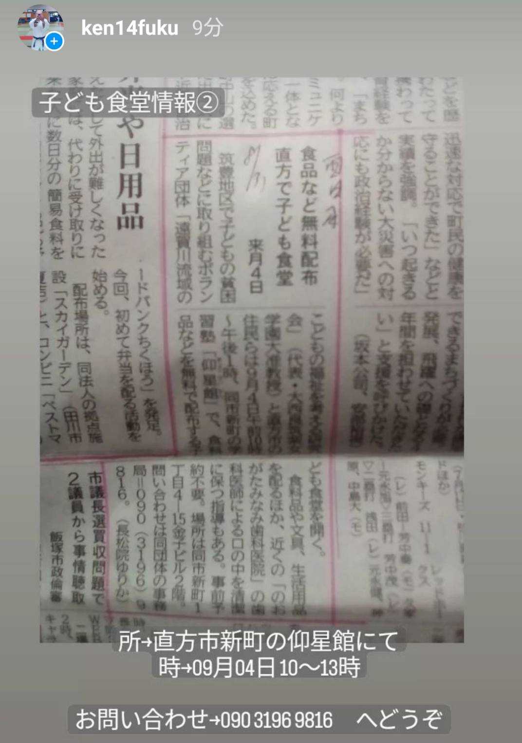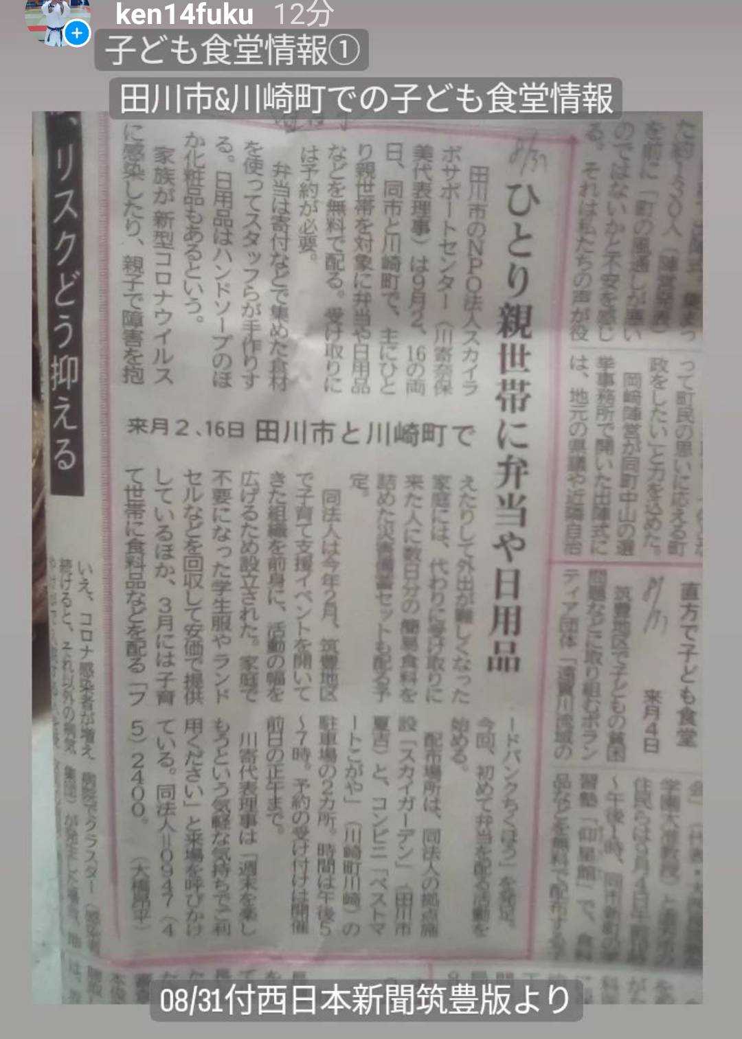 NPO法人スカイラボサポートセンターさまが執り行います、田川地区と川崎町での子ども食堂や無料配布会情報です。日程は、9/2日と9/16日との事で、あとの詳細は、画像の新聞記事をご覧下さいませ。末次通訳事務所・慈善事業活動部:末次賢治拝 (飯塚の「鯰田浦田子ども食堂」責任者)Aug.31 2022