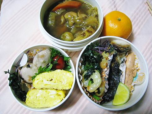 さわらの塩焼き魚卵の煮付け海老とほうれん草のオリーブオイルソテー里芋の煮物だし巻き卵プチトマト&ブロッコリースプラウト&酢だち&大葉添え鶏と野菜の和風カレースープみかん