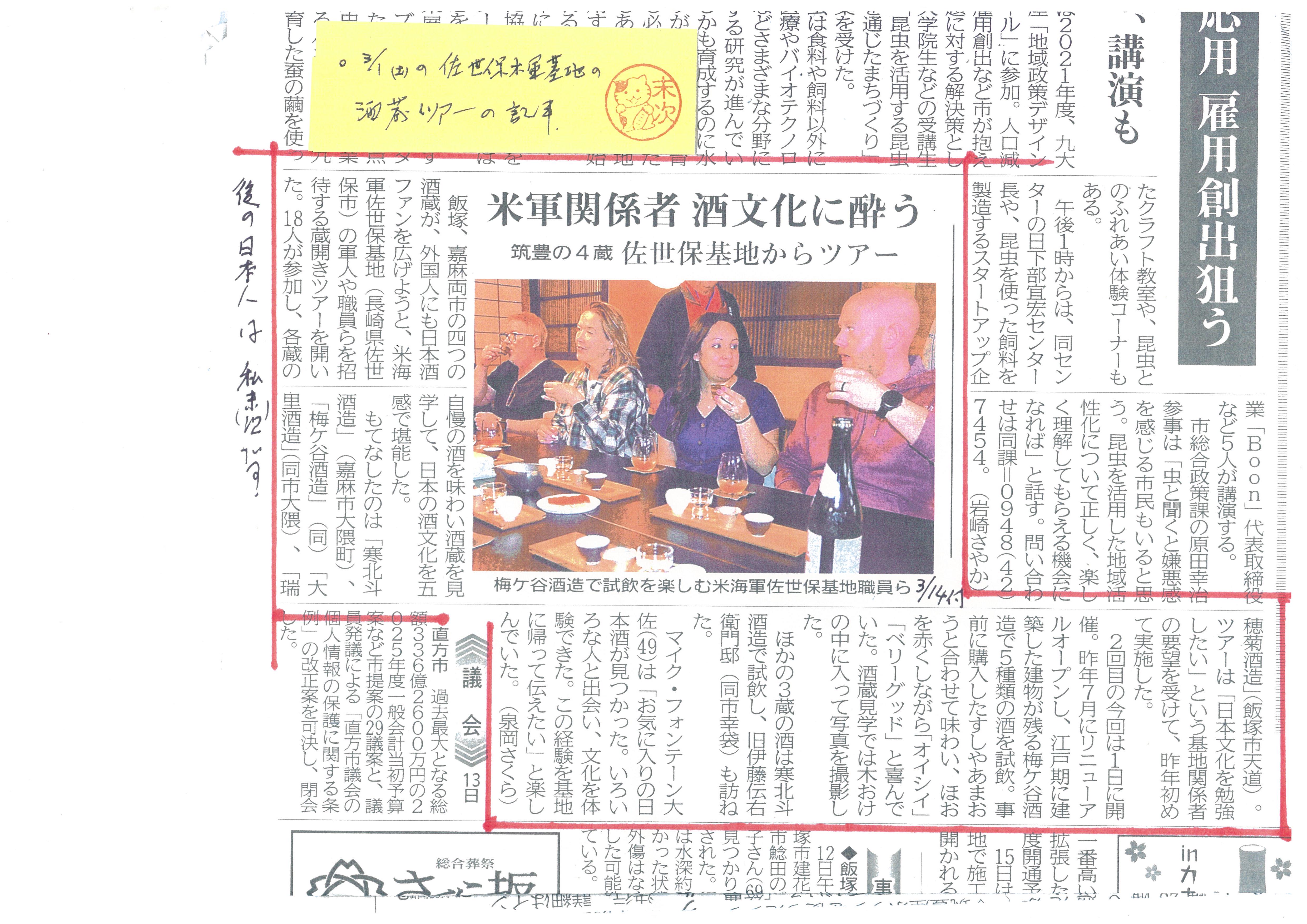 皆さま、毎度お世話になります。英語の末次です◎3/1の 【米軍佐世保基地関係者らのツアー】 で 飯塚市と嘉麻市の伊藤邸と酒蔵巡りツアーの記事が本日3/14に出ました。ご覧下さいませ。末次通訳事務所拝2週間前の 3/1に 私が通訳者として参加しお手伝いしました米/佐世保基地からの来訪者約20人のツアーの様子です。佐世保基地からですので、米軍側で佐世保/長崎の通訳案内士の女性が当初からご一緒で、私はサブ通訳者として、ご参加者個々に通訳をしておりました。質問に答えたり、この記事にあります、マイク大佐と新聞記者のインタビューの通訳やお酒など購入時の通訳仕事です。丁度、この記事の写真の後ろに法被を着た日本人が写っておりますが、これは、実は、私です。寒北斗酒造様から当日は法被をお借りして着用して、当該の通訳業務を執り行いました。ご参考までにどうぞ。この写真の場面では大吟醸・純米大吟醸ほか幾つかの種類の違いなどを説明しました。実は、小職は観光案内の通訳仕事には興味がありません。1つの例外★を除いて。(★例外は 宮本武蔵師の足跡をたどるツアー、武蔵師関係なら、進んで行います。こちらからお金を払ってでもガイドやガイド通訳を実施したいですね)私は医療やビジネス場面での通訳が主です。ですが、通訳には変わり有りませんから、こうした地域の観光案内の通訳業務は、無償ボランティアとしても積極的に行っております。ご参考くださいませ。何か必要性がありましたらお声がけくださいませ。末次通訳事務所では、ボランティアでもこうした通訳業務を執り行います。必要があります方は、どうぞ、御声がけ下さいませ連絡先; 080-6433-9523 email ➡ yhniten14k@yahoo.co.jp 末次通訳事務所・慈善事業(通翻訳)活動部 3 14 2025