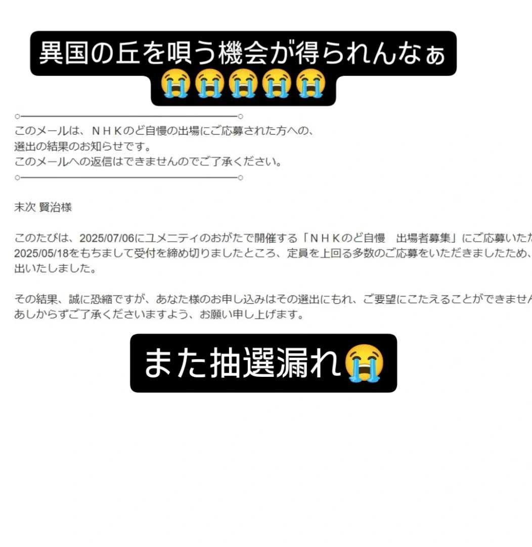 ◎NHKのど自慢にまた予選への抽選が外れました!7月の最初の日曜日に 直方市に NHKのど自慢が来ます当然応募しておりましたが、あら~またやが!!!直方なら近いし予選から出れると思ったばってんがくさ、なかなか出られんね。次回の目標は、9/28大分県の豊後大野市です。2ケ月前になったら、応募します曲は、「異国の丘」、或いは 「丘を越えて」または秘密兵器の「誰(たれ)か故郷を想わざる」 を以て応募します!それを思うと、よく、うちの父は、三回も、のど自慢に出演出来たなぁ!!【異国の丘】を、NHKで唄いたいなぁ!!今度は、9/28に 大分県の豊後大野市に来るきそれに応募しよう!!!末次通訳事務所・芸能事業部JUNE 20 2025