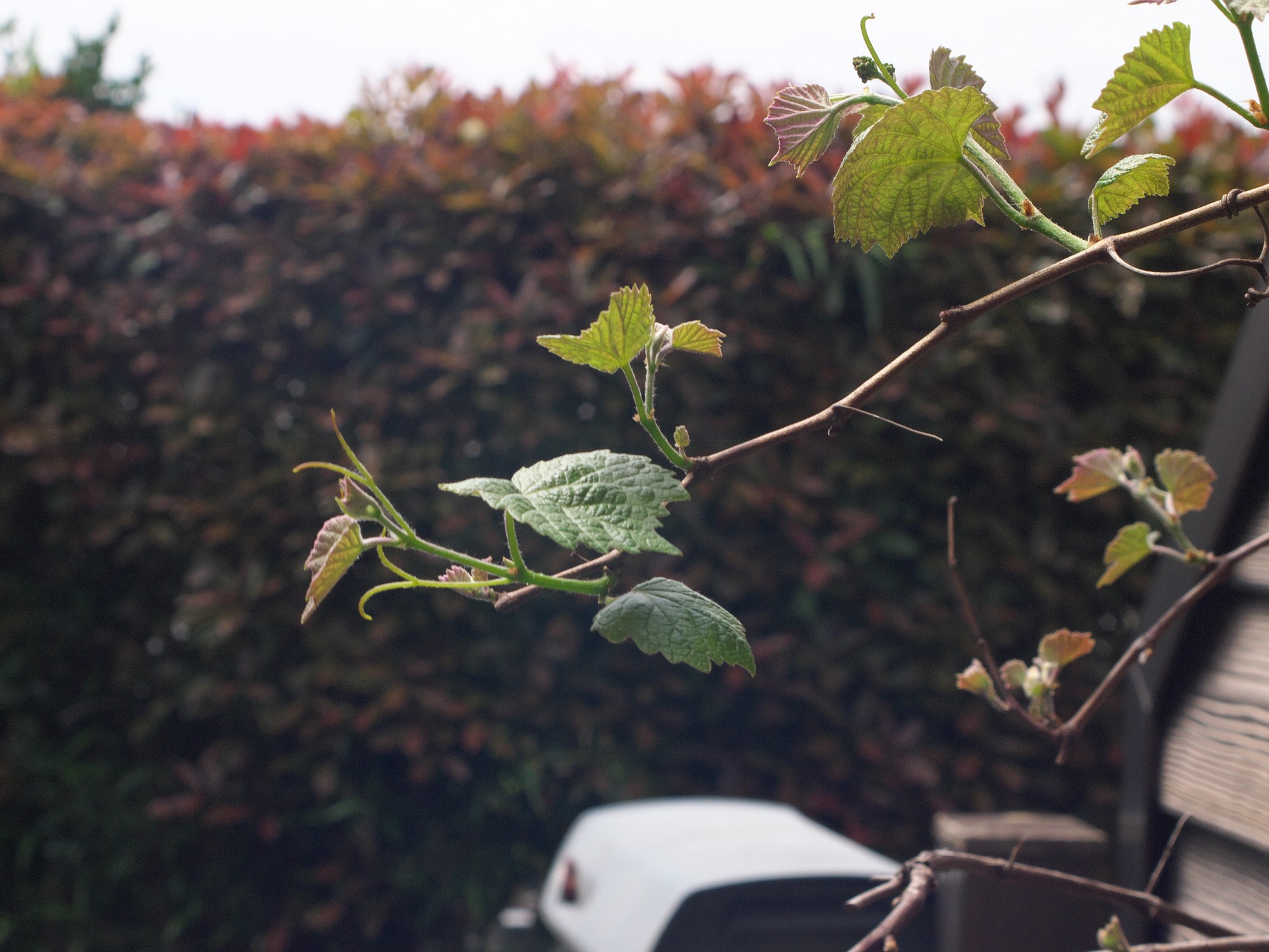 3月には、枯れ枝状態だった巨峰ですが、芽が出てきたなぁと思ったら・・・・早くも花穂が出てきました。