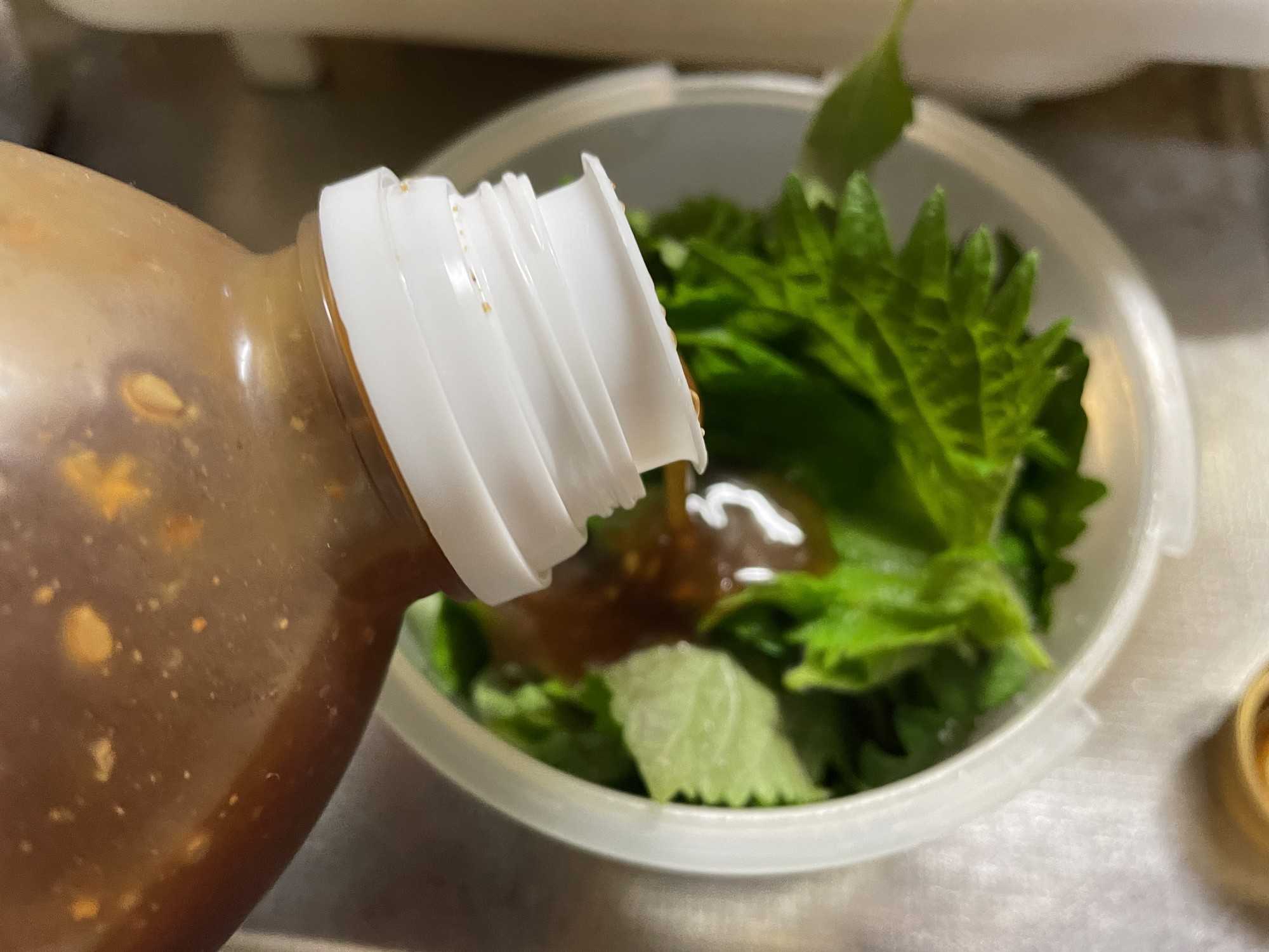 水気を切ったシソに塩を適当領ふりかけ、軽くもんでおいてから、100均漬物器に詰め、焼き肉のたれを振りかけます。好みでトウガラシやすりニンニクを加えてもいいですね。