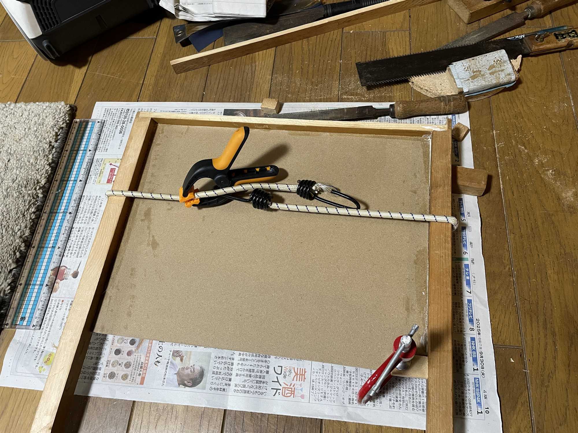 長編側の枠をまず先に。幅も半分に入りました。強力なゴムひもで固定していますが、これがなかなか・・・固定しているはずの枠が倒れてしまうんですよね。倒れないように抑えてあります。