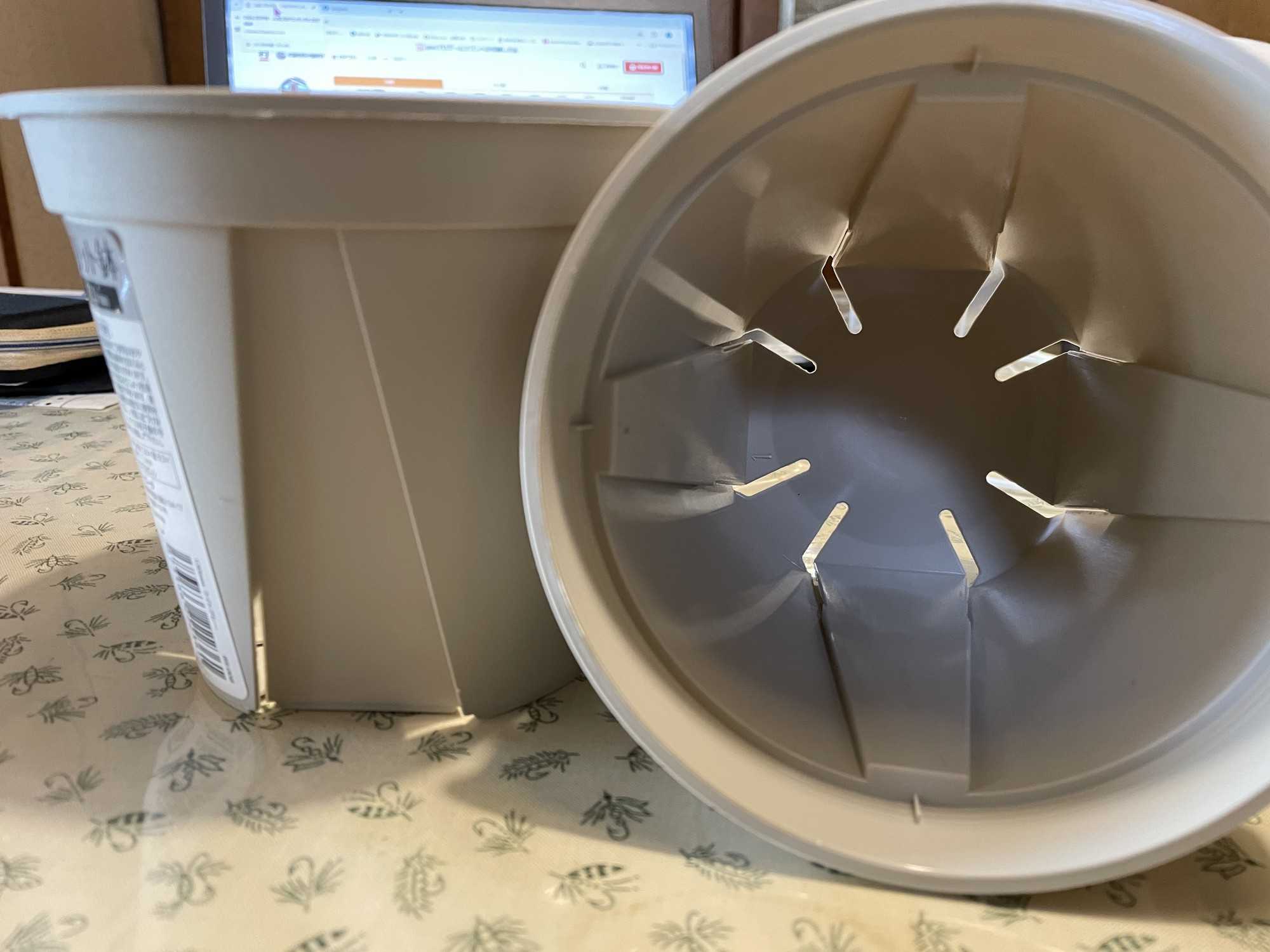 容量は0.9リッターほどですから、挿し木から鉢上げし、次の代で使うサイズを想定しました。やはり容量の小さい鉢は夏場に乾ききるのが怖いので。まぁ通過地点で使う鉢なので数はそんなにいらないだろうと2個買いましたが¥110だったらもう2個買ってもよかったかも。