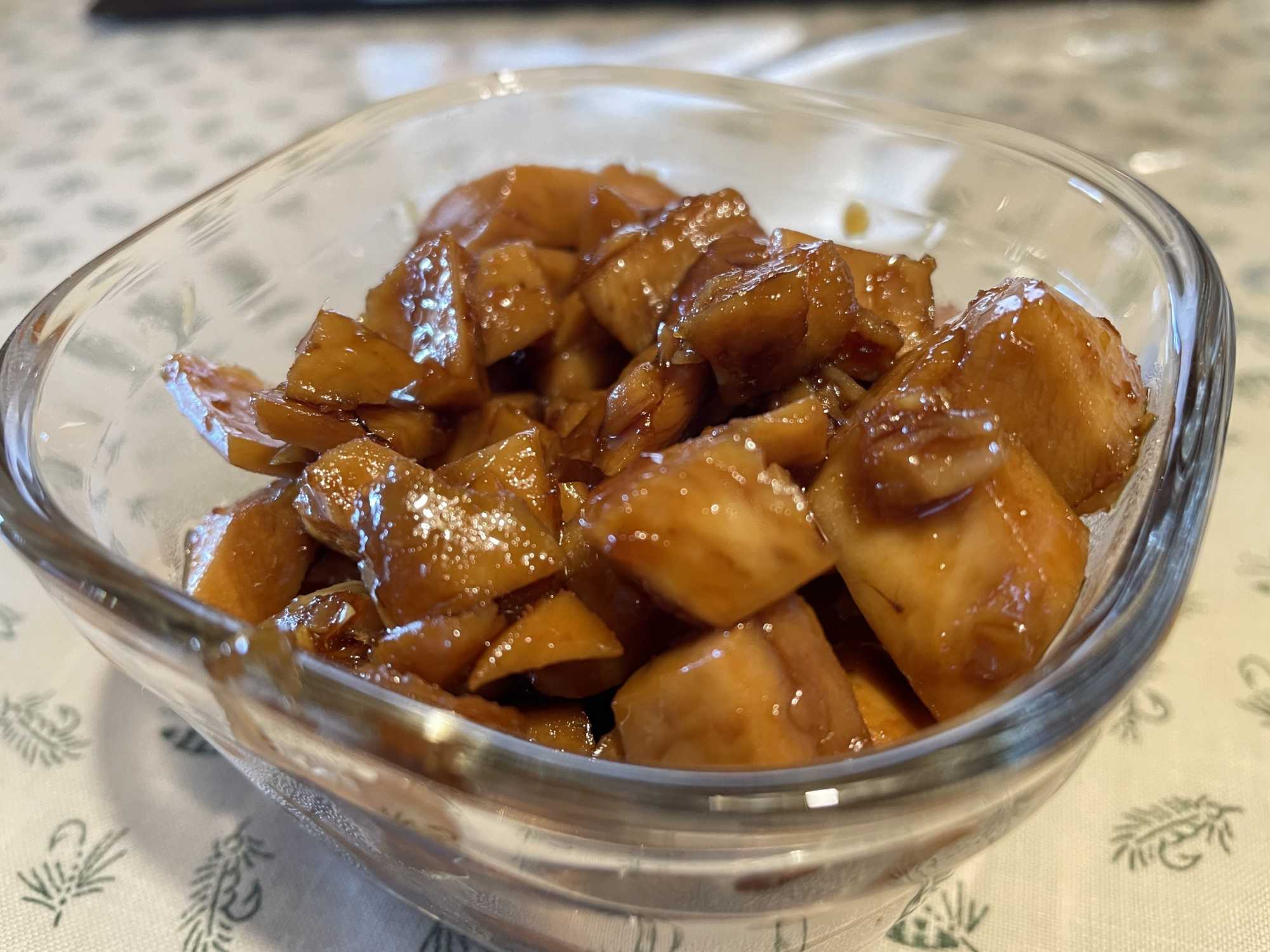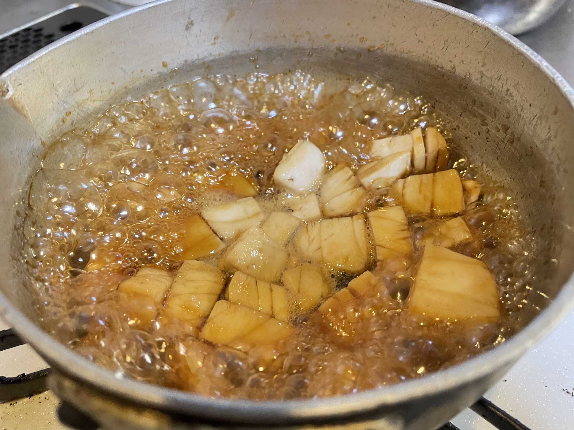 それを醤油2,味醂2,酒2,砂糖1、しょうが少々の比率の煮汁で煮詰めていきます。