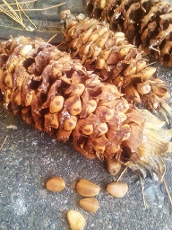 リスが住んでいる駐車場 裏の林セガレと探索しているとなんだか不思議な実が大きな松ぼっくり?松ヤニが指につきつつ この実を取ってみると石で割ってみると薄皮をむいてみると 松の実!食べてみると あの松の実の味!ジェノベーゼの味だ~*>∀<*ちょっと感動*^^*私たちは初めて知ったけれど リスはずっと前から知ってたんだね^^