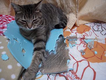ここ何日か、ブツブツのせいでひきこもり生活を余儀なくされています心なしかダルイので、日がな一日ごろごろとトドのように暮らしてますそんな私を隣の部屋から呼ぶ声が~「にゃ~~おぅん、にゃ~~おぉん」訳すと「かあさんヘイかあさーん」ってとこでしょうかねぇぎんがかなりテンション高めにできあがってるみたいです行ってみると、そこにはボロボロにされた保温シートが やけに誇らしげな表情のぎんそんな事しといて「どうだぁー」って顔されてもねぇ
