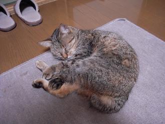 今日もはなはストーブの前で気持ち良さそうに寝ていますでも部屋の出入り口で寝てるので、ちょっと移動してほしいのです 「はな~、起きてよ~」「眠いからやだ~」 ますます足の間に顔がめりこんでいってます「起きてよ、はなってば~」「なによ、寝てたのに~」 すごい眠そう途中で起こされて、かなり不機嫌みたいです