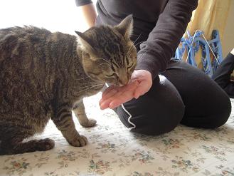 ぎんが手をぺろぺろとなめています 自分から頭を手に押し付けて、なでてもらってる感を味わっています そして再びぺろぺろに戻ります もう、うっとりしちゃってます これは何をしてるかと言うと、私の手にまたたびの粉がのってるんですねまたたびを見せられたら、ぎんは簡単に誘拐されちゃいそうです