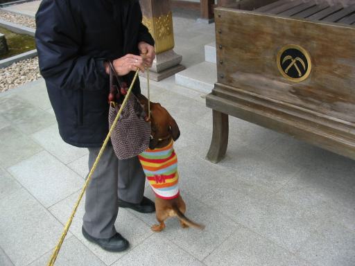 信仰ポリシーがないので神社に母とロビンを連れて初詣に行って参りました。午前9時ということでほとんど人がいませんでした。ロビンは群れるのが嬉しいので楽しくてしょうがない様子。ロビンは石の階段も颯爽と上がります。(たぶん勢い付けて上がらないとしんどいんだと思いますが)んで私たちが立ち止まると抱っこしてぇ、の催促です。ワタシはデジカメ撮影で詣でてませんが母は一応詣でてました。お参りはどうでもいいから抱っこしてぇ、と母にねだるロビン。暖房の効いた事務所で一眠りした後、散歩でも行きまっか?のロビン。いつも付き合ってやってるんだから、ちょっとはいいワンコにしてろよ!