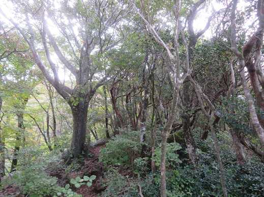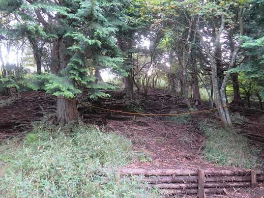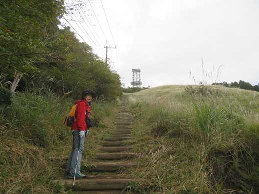 この長い丸太の階段は、段差がある上にこの先かなり崩れて歩きにくい。