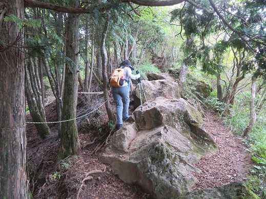 岩をよじ登り、木の根を掴んで木の根に足を掛け