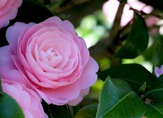 乙女椿のピンクが庭の光を集めるように咲いています。