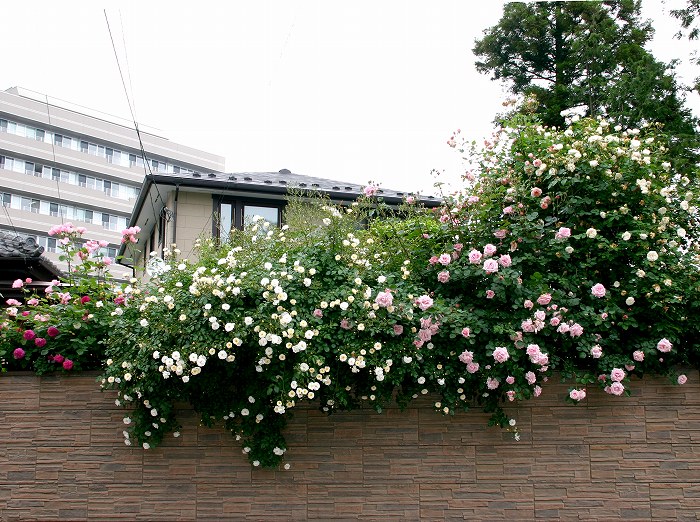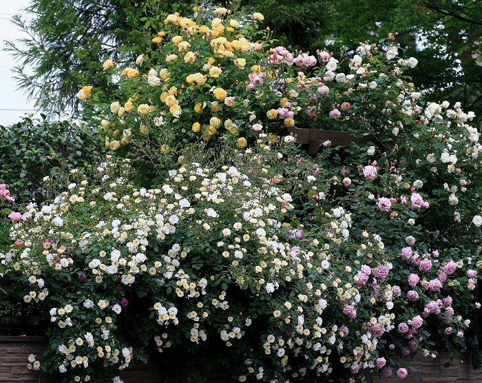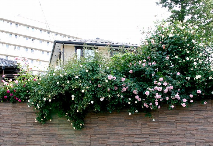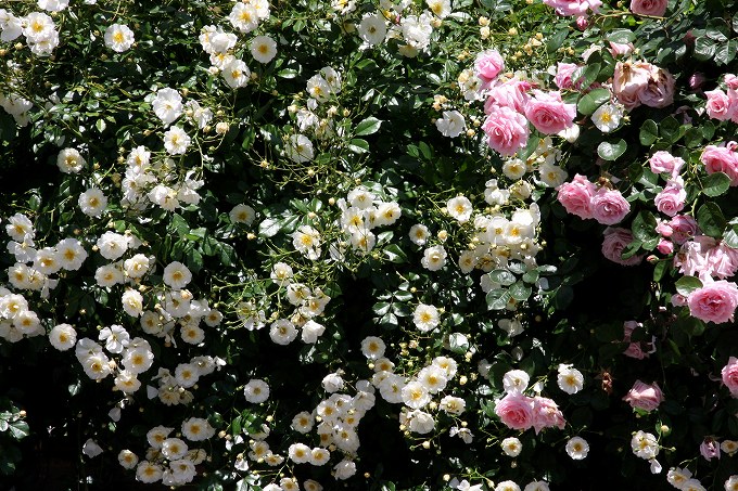 パーゴラの上のほうに、混じってるピンクがERのウイリアムモーリス。