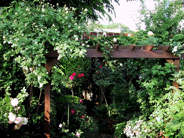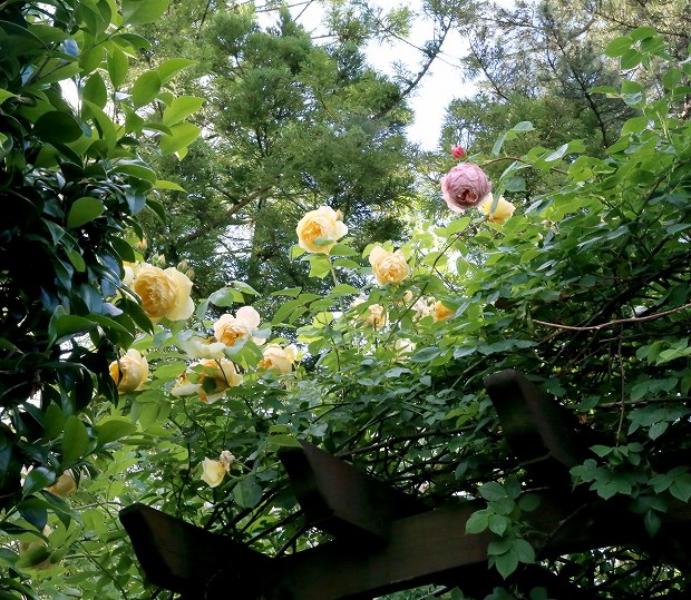 ひとつのパーゴラにこのほか、二種のつる薔薇も沿わせています。