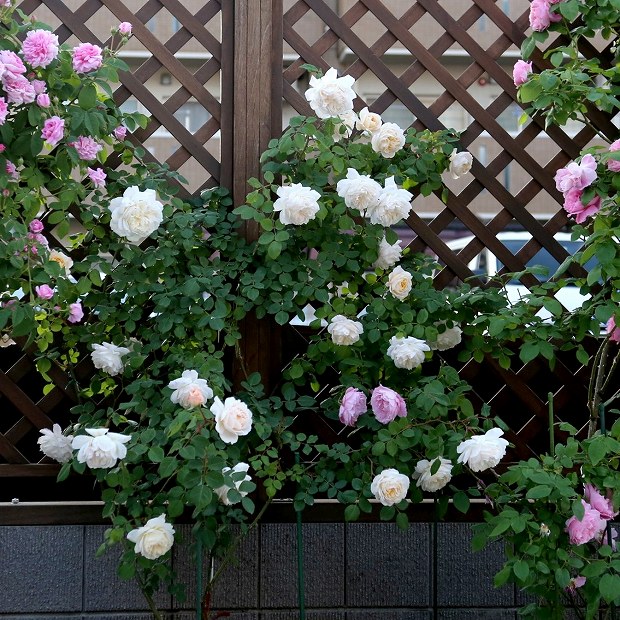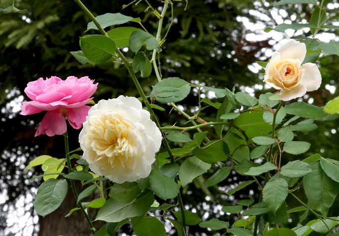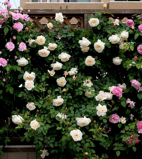 大きな塊が細い枝をアーチ状にたわませる咲き方は、力強い自由咲き。