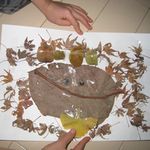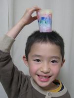 図工の作品を持ち帰っていたので、記念撮影お花紙で、色々な食べ物を作ったらしく、この写真は、梅干。Kooってば、演技派